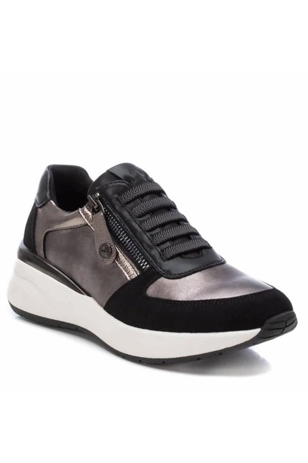 Zapatilla de mujer, de la marca Xti. Fabricada en un material que imita la piel. Detalles metalizados. Cierre cremallera lateral y cordones para un mayor ajuste. Suela de goma gruesa y antideslizante. Con plantilla extraíble.