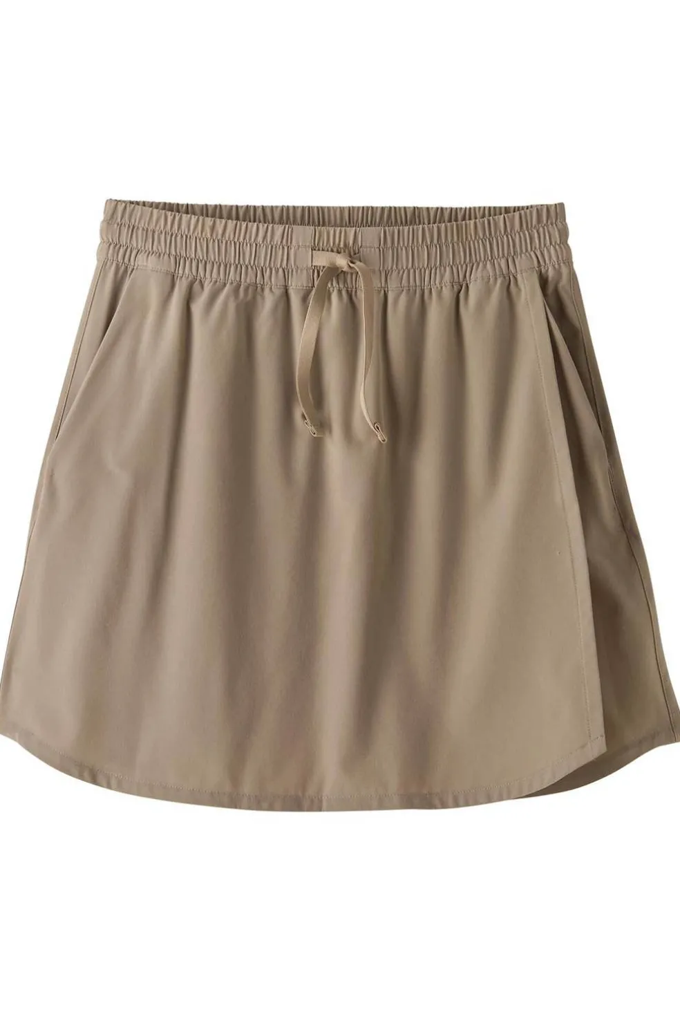 Falda pantalón de gran versatilidad, ideal para desplazamientos al trabajo en bicicleta durante el verano y para muchas otras actividades; está fabricada con tejido elástico y cómodo hecho de poliéster reciclado y spandex, longitud hasta por encima de las rodillas y shorts liner cuyo largo de piernas es de 5,5” (13,9 cm).