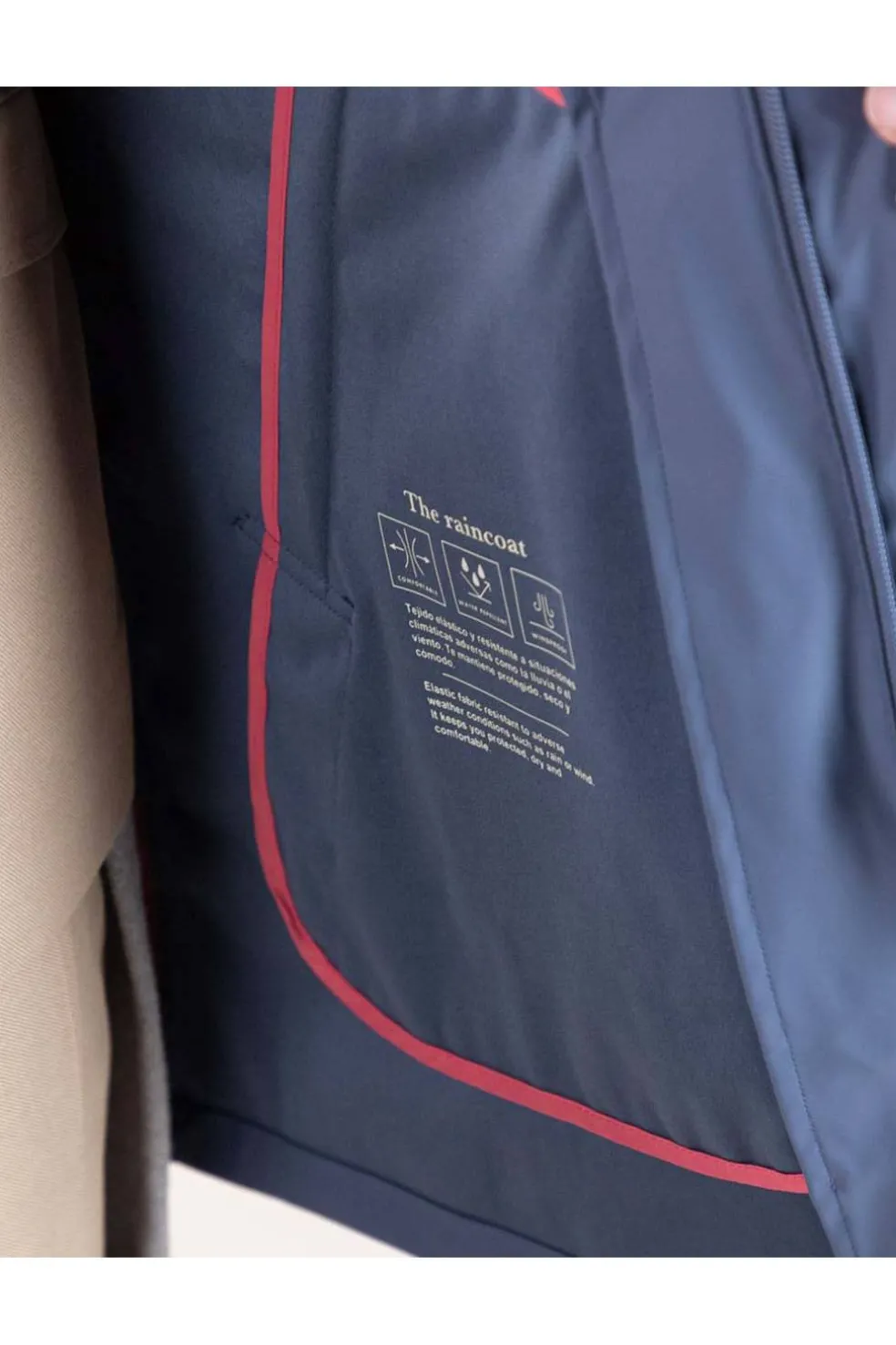 Gabardina de hombre con acabado engomado confeccionada en poliéster reciclado, diseñada para ofrecer protección contra la lluvia y el viento. Su corte recto proporciona un versatilidad, incluye detalles de bandera, logo engomado situado en la manga,sistema de cierre con automáticos para ofrecer mayor funcionalidad. Combinando estilo, sostenibilidad y comodidad en una prenda versátil.