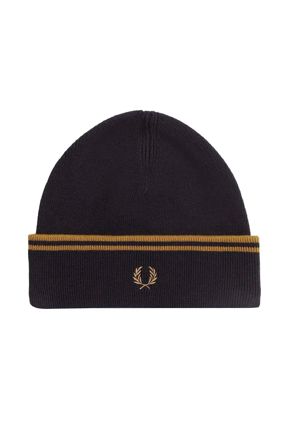 Gorro de canalé en mezcla de algodón y lana merina, realzado por el ribete con dos franjas en el borde.