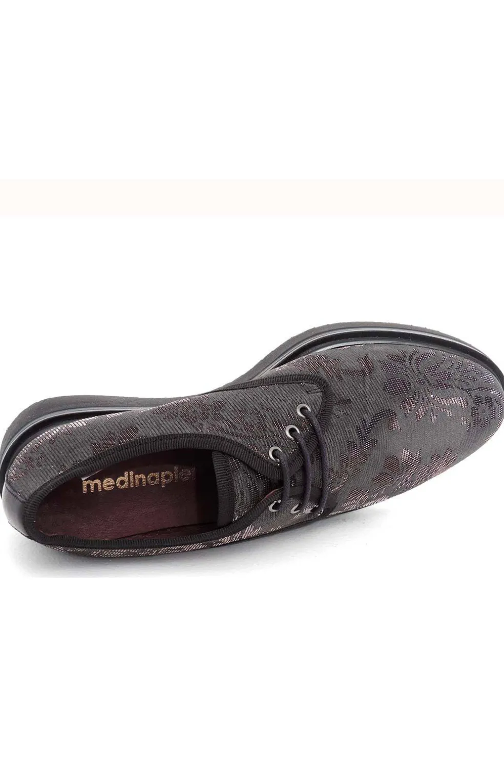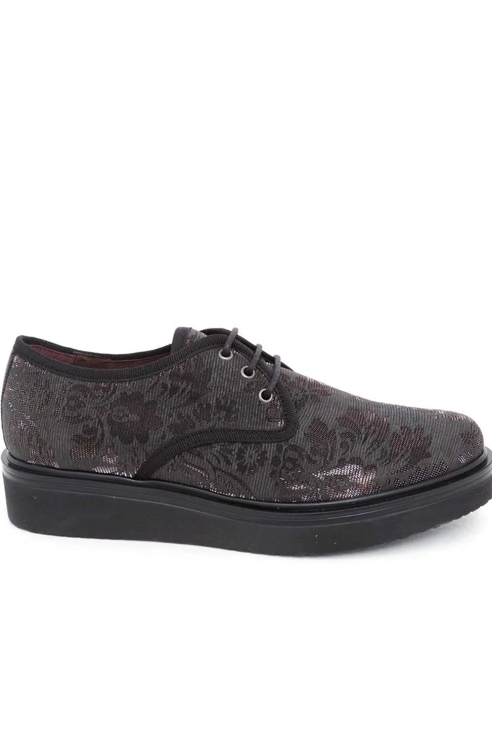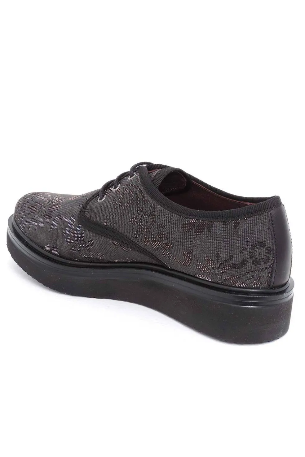 Zapato de piel con detalle de flores grabadas en contraste de color. Se abrocha con cordones. Piso grueso de goma antideslizante.