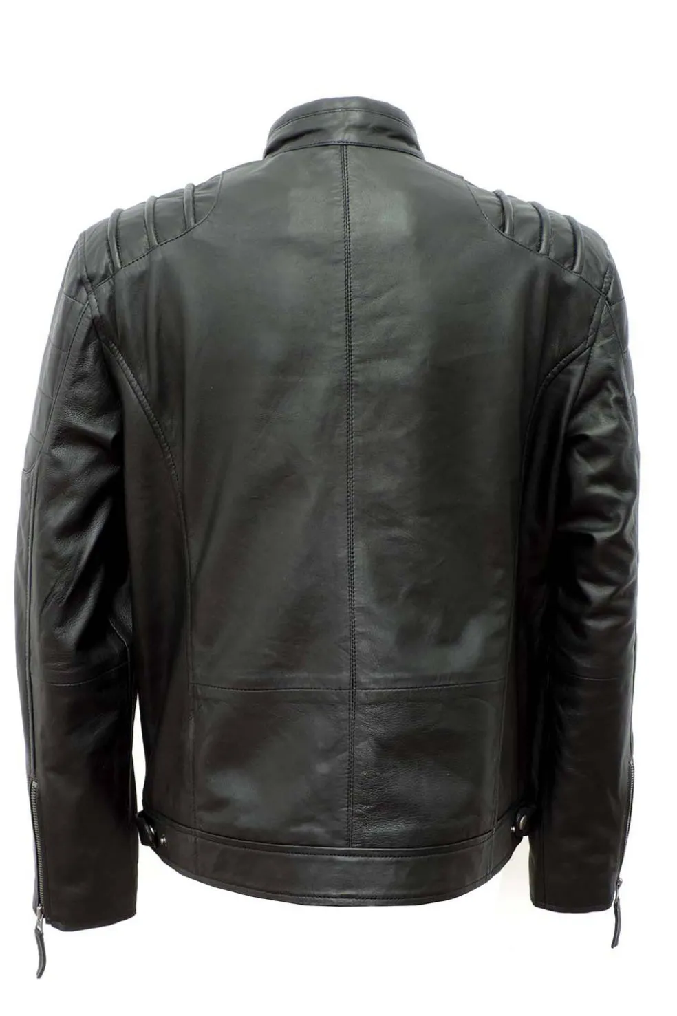 Cazadora de hombre en piel natural con línea motera. Aspecto vintage y piel muy suave. Destaca el cosido acolchado de los hombros.