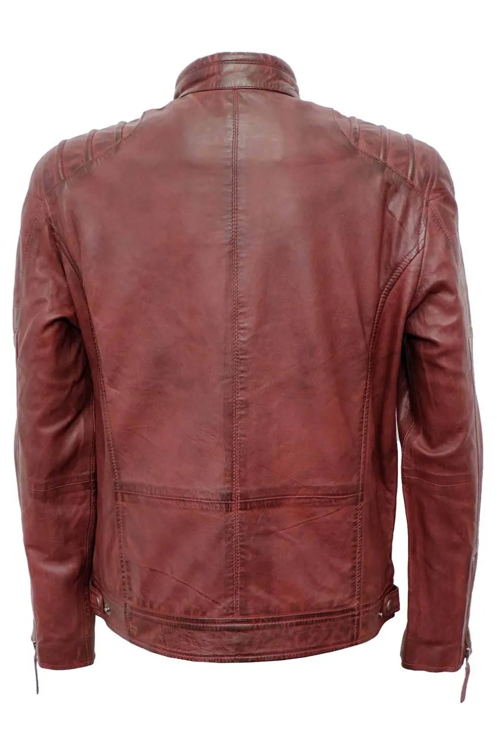 Cazadora de hombre en piel natural con línea motera. Aspecto vintage y piel muy suave. Destaca el cosido acolchado de los hombros.