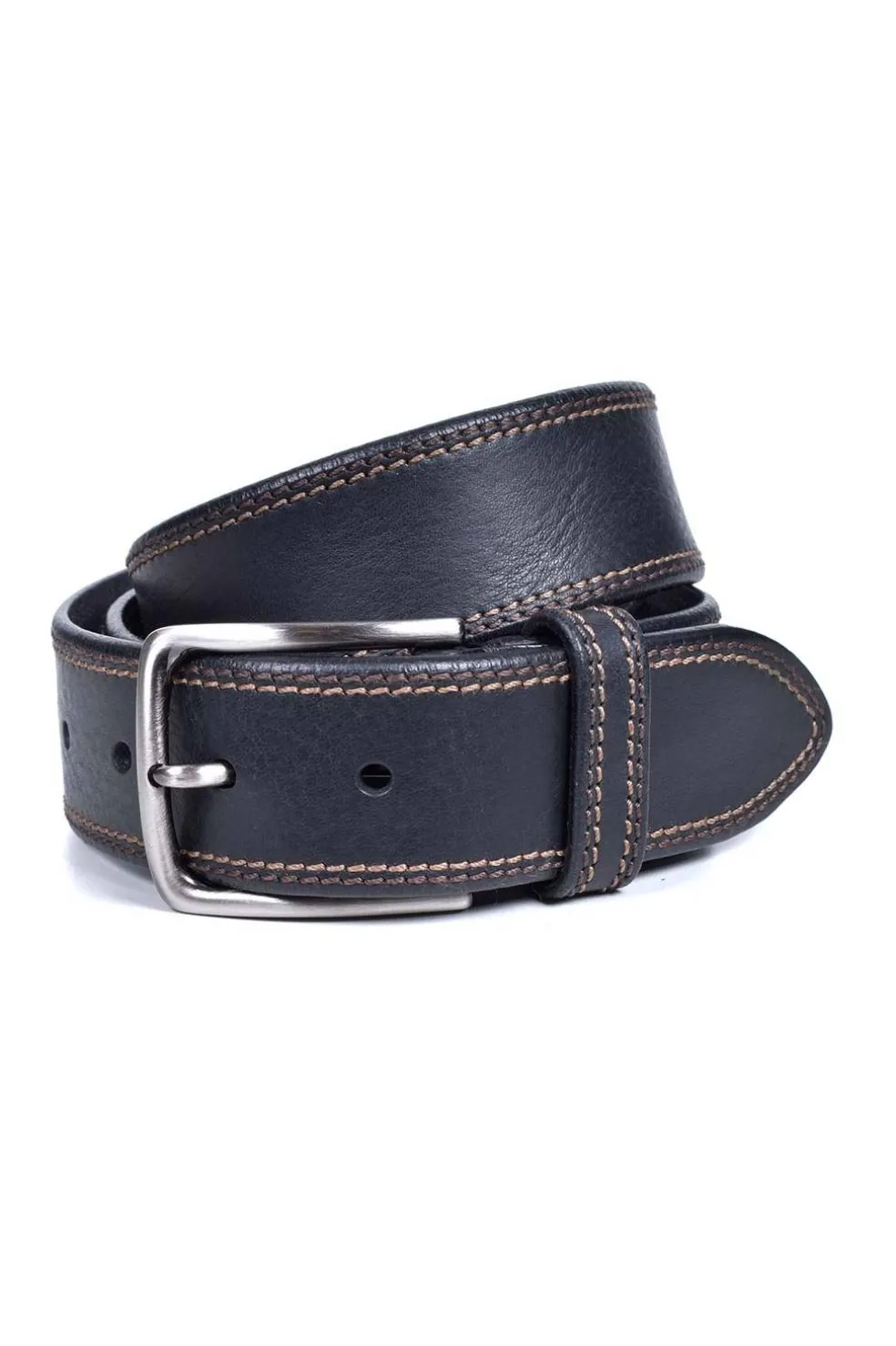 Cinturón de piel. En color negro y detalle de doble pespunte lateral bicolor. Con botón oculto que facilita cortar el cinturón a la medida deseada.