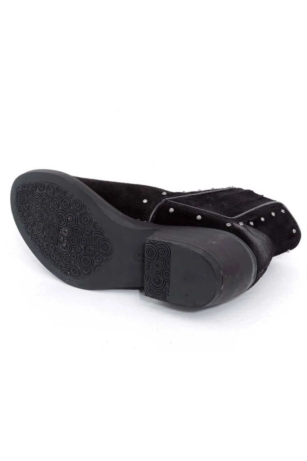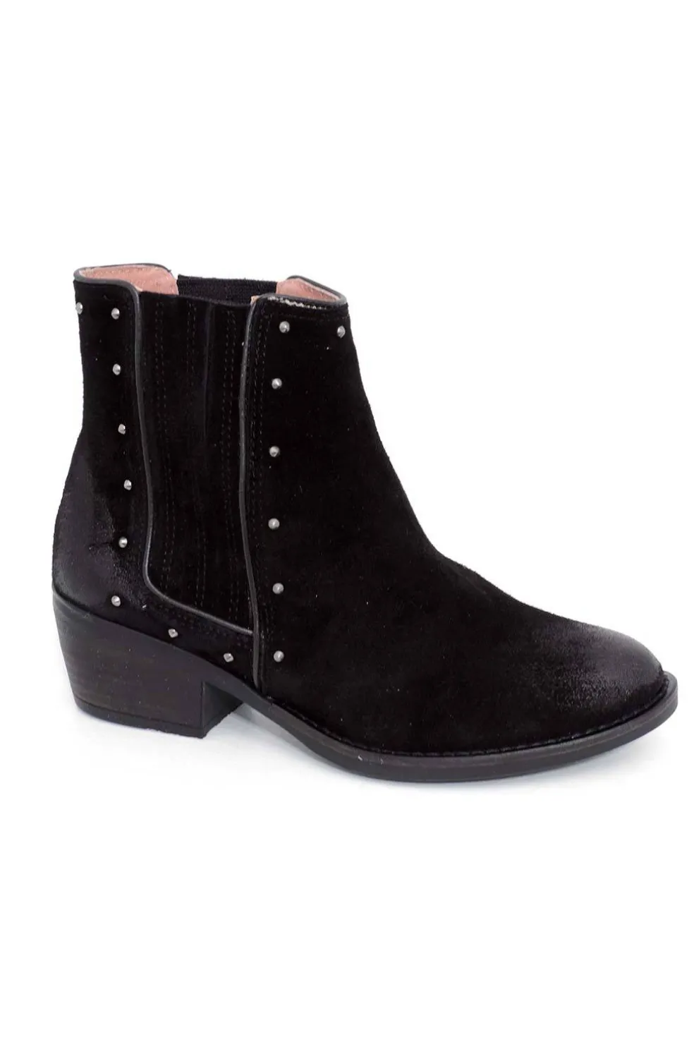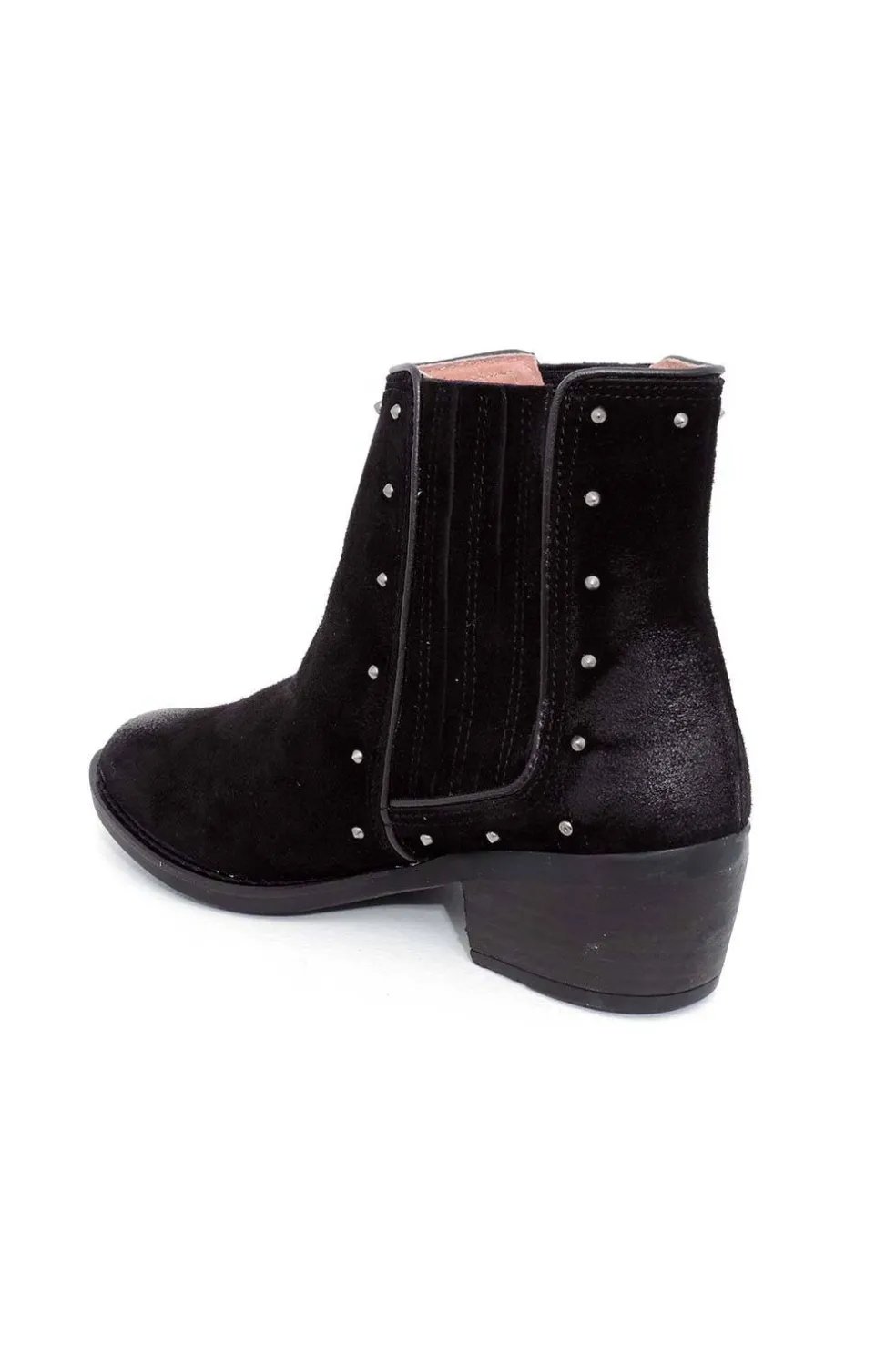 Botín de horma campera en serraje. Elásticos laterales adornados pequeñas tachuelas.