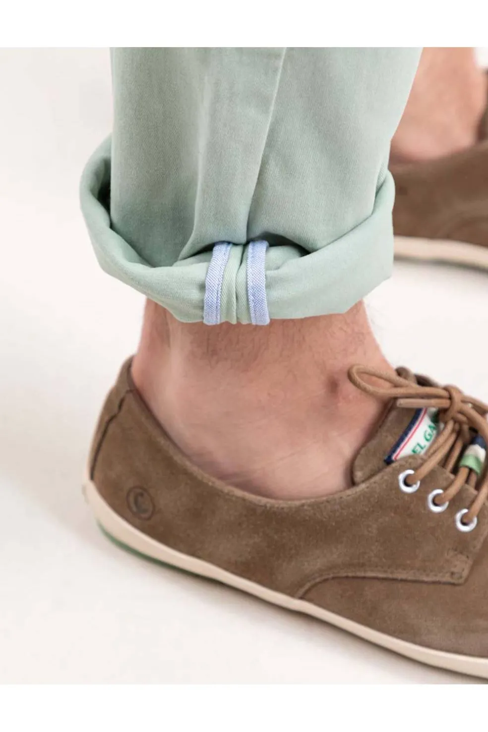 Pantalón 5 bolsillos de hombre confeccionado en tejido de sarga con 77% algodón, 20% de algodón reciclado y 3% elastano que aporta un mayor confort y un fit más cómodo.