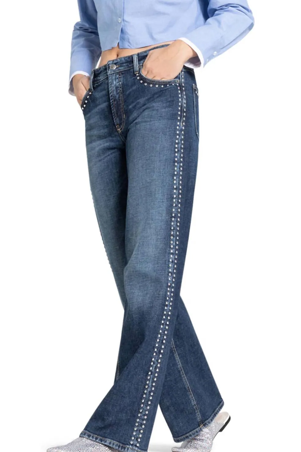 Este pantalón vaquero de corte femenino combina estilo y originalidad. Está confeccionado en denim de alta calidad que ofrece comodidad y resistencia. Su diseño incluye tachuelas circulares decorativas estratégicamente colocadas a lo largo de los laterales de las piernas y en los bordes de los bolsillos, aportando un toque moderno y atrevido. El ajuste favorece la silueta, con una cintura media y un corte que se adapta suavemente a las caderas y piernas. Ideal para looks casuales o para darle un giro urbano a cualquier conjunto, destacando por sus detalles metálicos que reflejan personalidad y estilo.