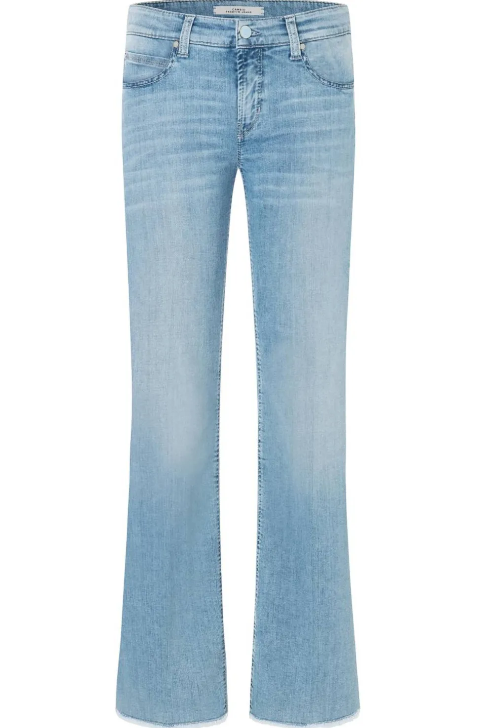 El Cambio Paris Flared presenta un corte acampanado de largo completo (“Flared-Fit Long”), con talle medio y costuras contrastadas. Su distintivo bajo abierto y ligeramente desflecado añade un toque moderno y desenfadado, ideal para looks tanto casuales como más estilizado