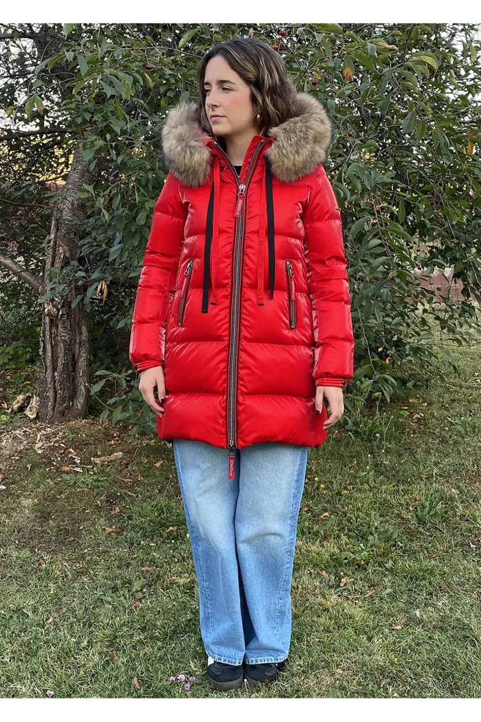 La capucha con pelo natural añade un toque de sofisticación y abrigo extra, haciendo de esta chaqueta la compañera perfecta para los días más fríos. Su tono rojo intenso aporta personalidad y convierte cualquier look invernal en un conjunto lleno de estilo.