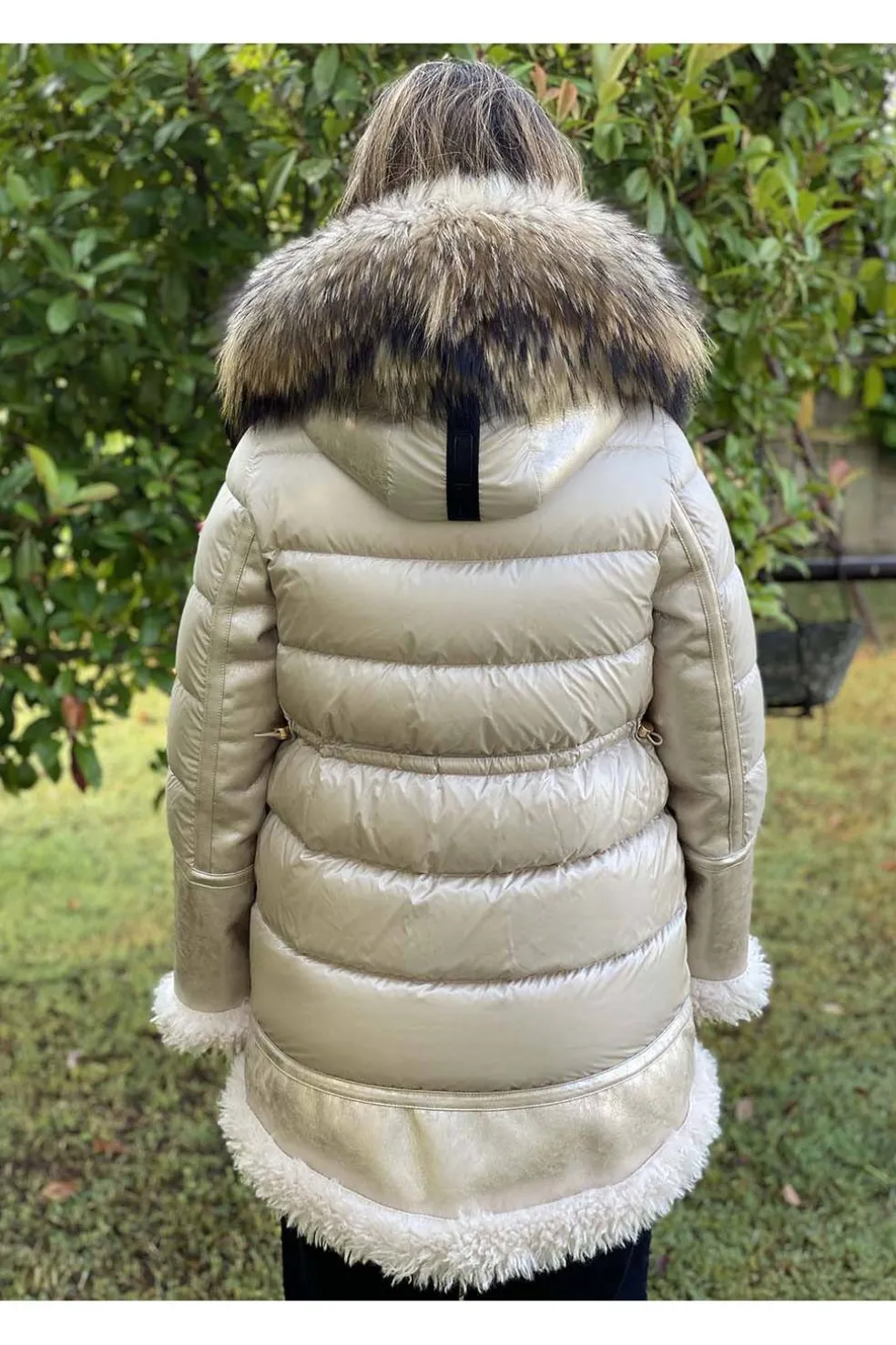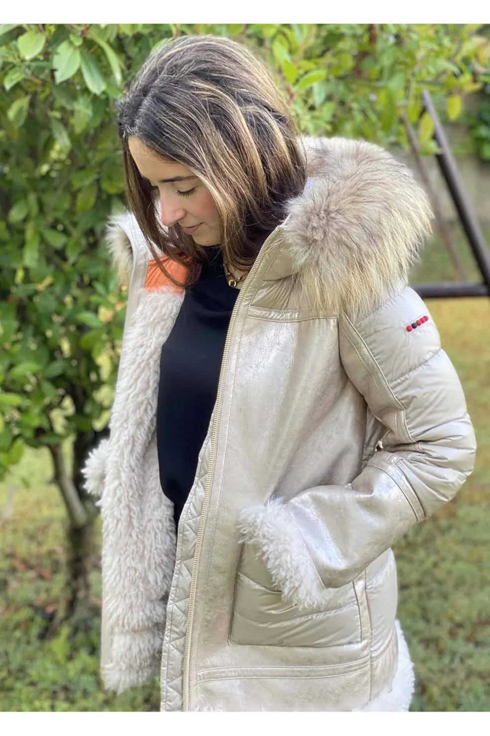 La chaqueta de plumas Taciana en color beige, es perfecta para la temporada otoño invierno. Originales bolsillos laterales con pelo y acolchados, cierre central con cremallera, parte trasera y mangas acolchadas.