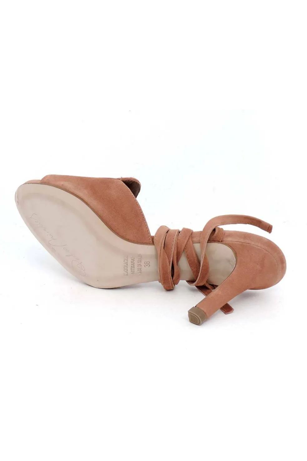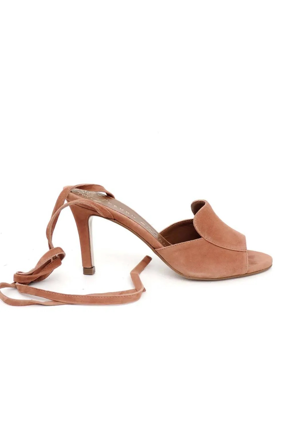 Zueco de piel anteada con tiras estrechas para sujetarlo a lo largo de la pierna.