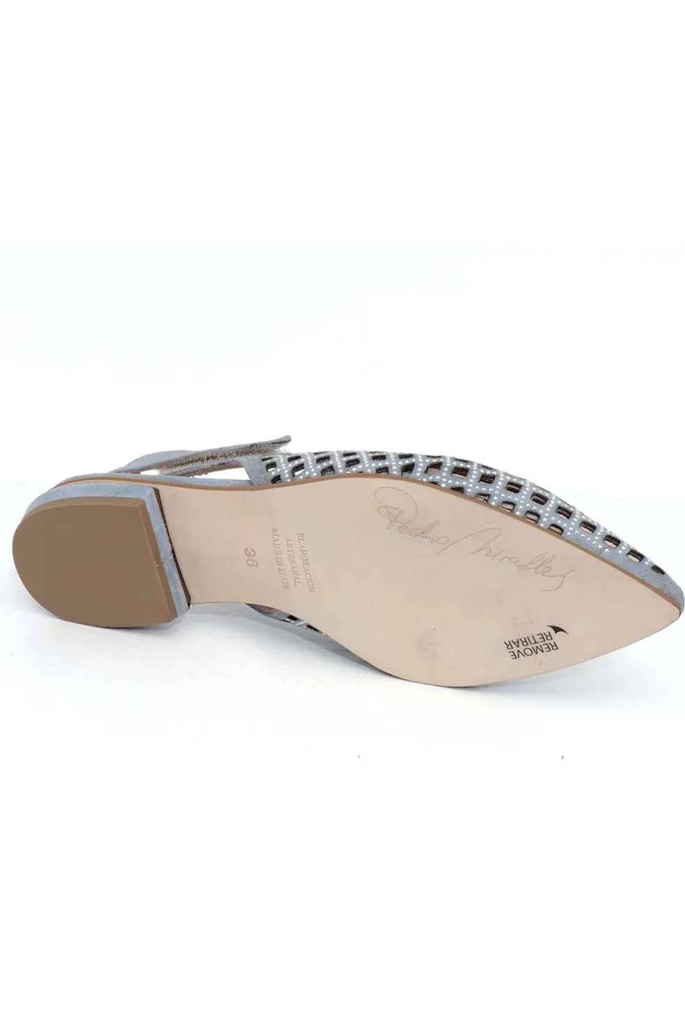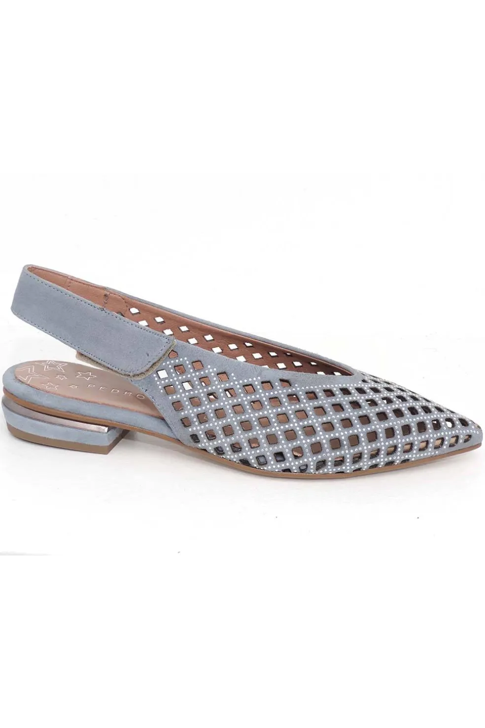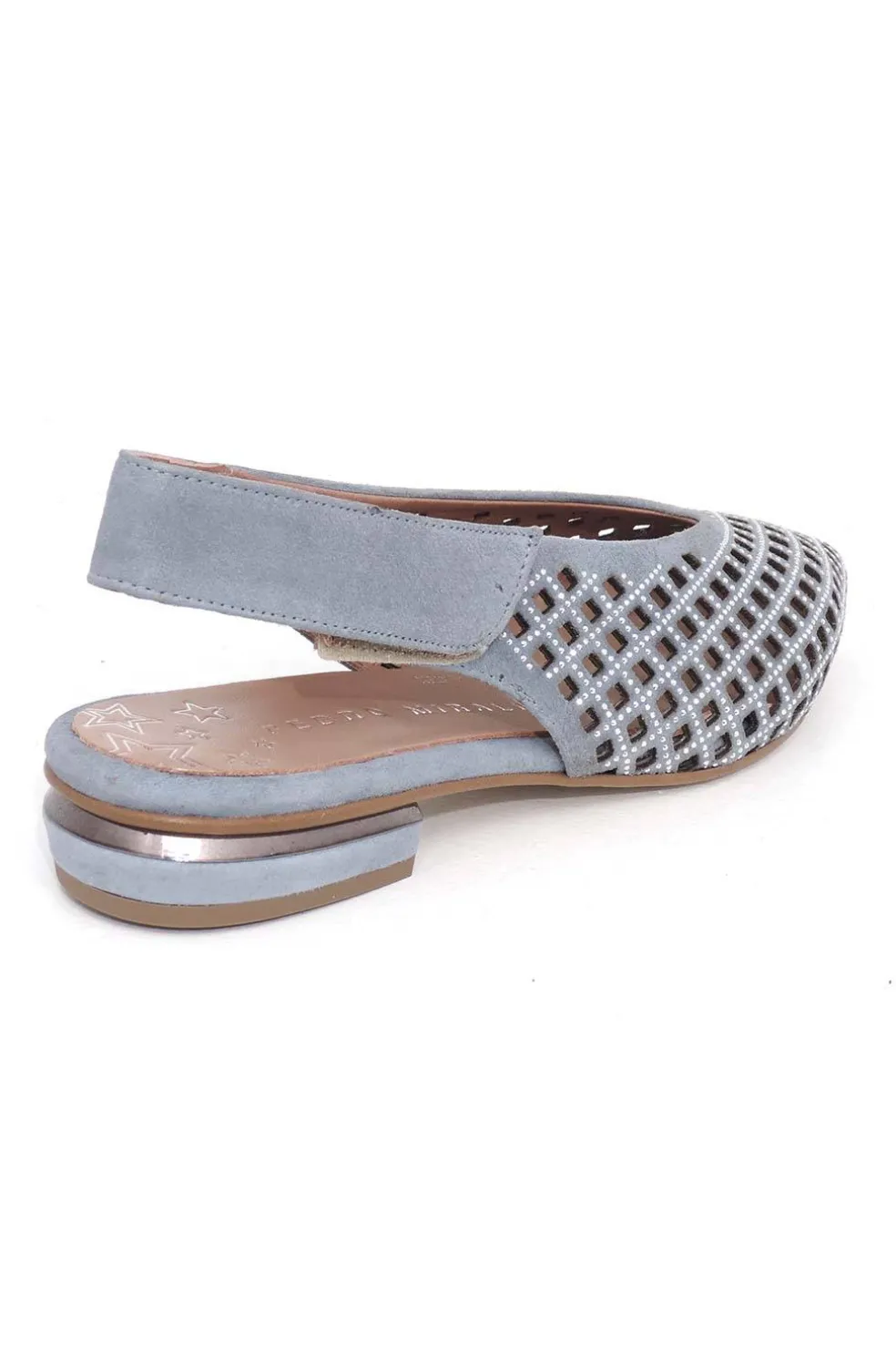 Bailarinas planas destalonadas de ante. Este diseño cerrado de punta fina se ajusta perfectamente al talón con un cierre ajustable de gancho y bucle. Su tacón de 2 centímetos y medio con adorno metálico aportan un toque distintivo.