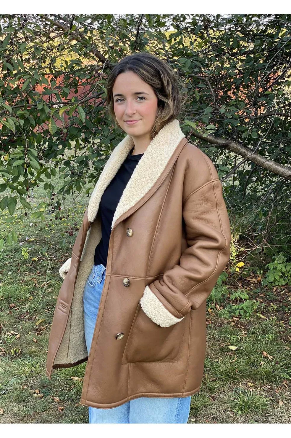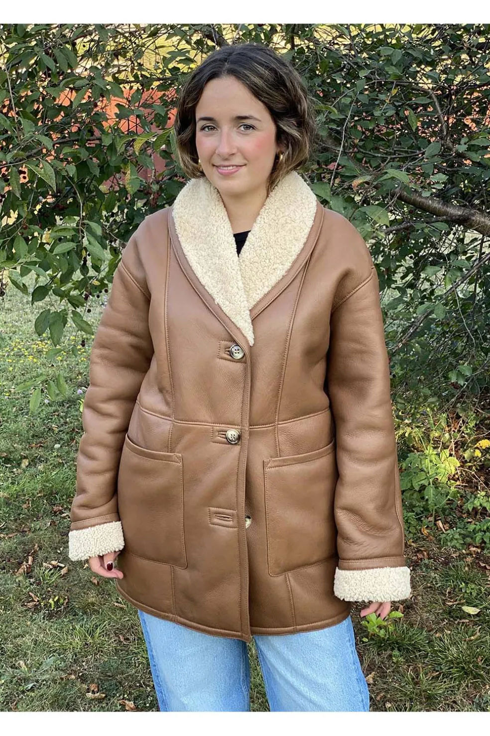 Eleva tu estilo con esta chaqueta de piel vuelta en un elegante tono marrón. Su interior de pelo rizado en color beige aporta calidez, suavidad y un contraste sofisticado. Diseñada para combinar funcionalidad y tendencia, cuenta con prácticos bolsillos exteriores que añaden comodidad sin renunciar a la estética.