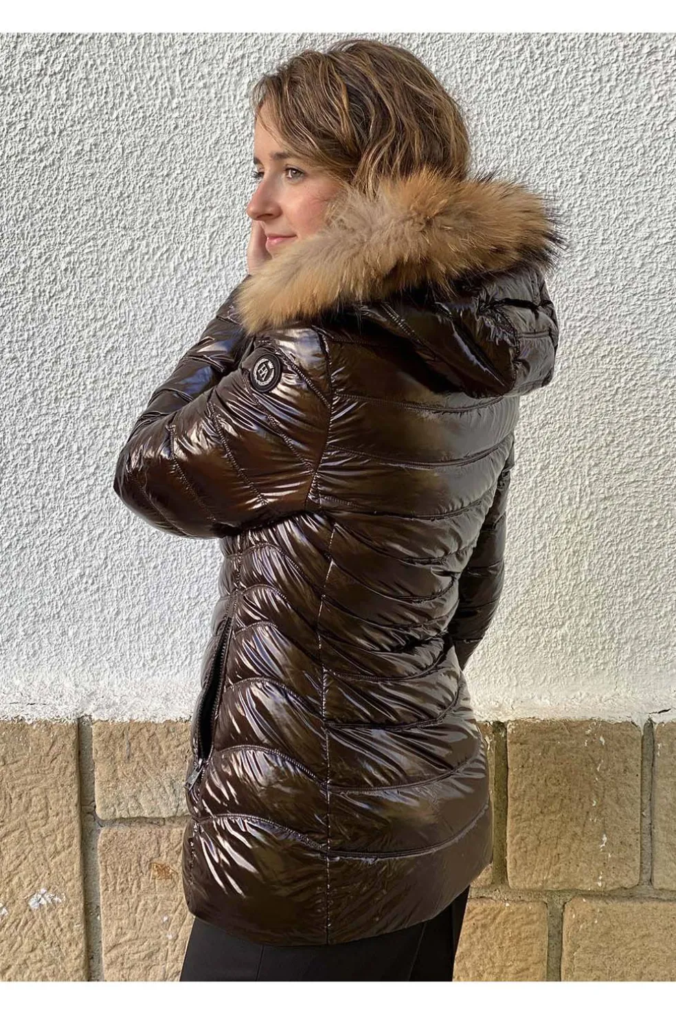 Plumífero corto de mujer. Cierre central con cremallera personalizada de doble carro. Bolsillos con cremalleras. Capucha desmontable con pelo natural. Tejido repelente al agua y cortavientos. Relleno de plumón termorregulador.