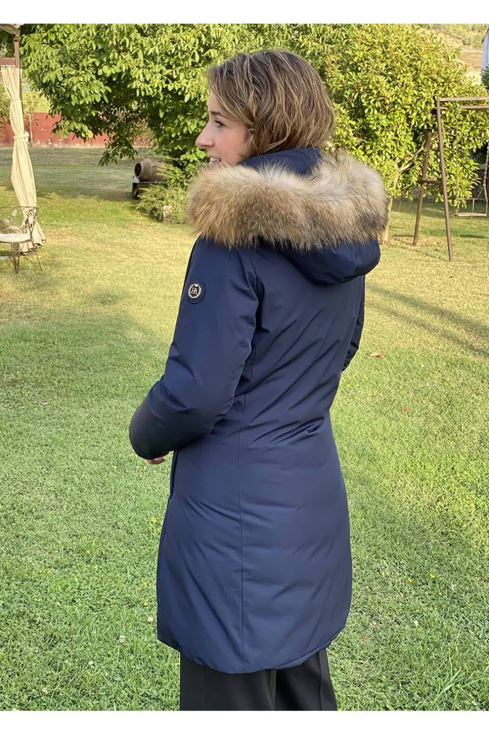 Parka larga de mujer con tiradores interiores tipo mochila.