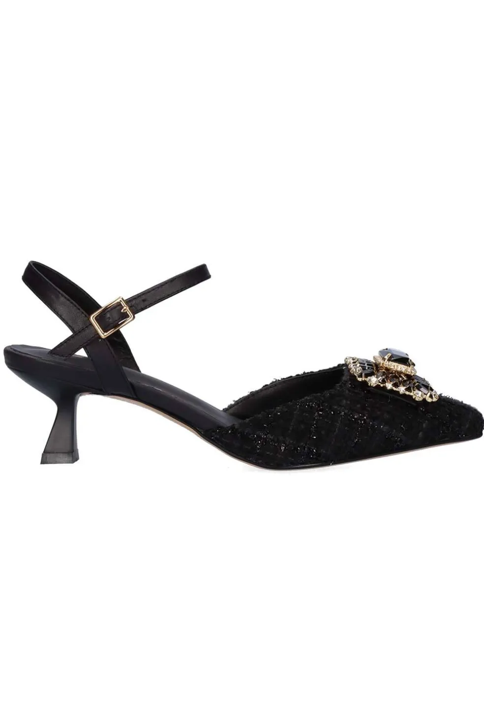 Sandalias de punta y adorno de brillantes. Exterior tejido tipo Chanel .