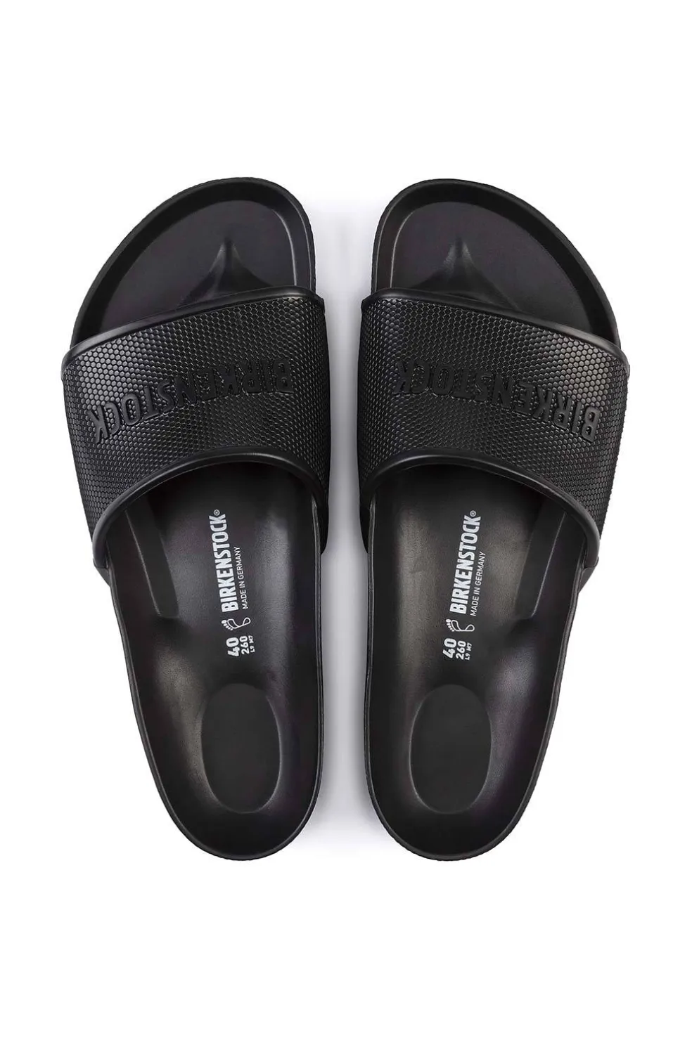 El modelo BIRKENSTOCK Barbados destaca como chancla deportiva con un diseño de hexágonos y la inscripción del logotipo.