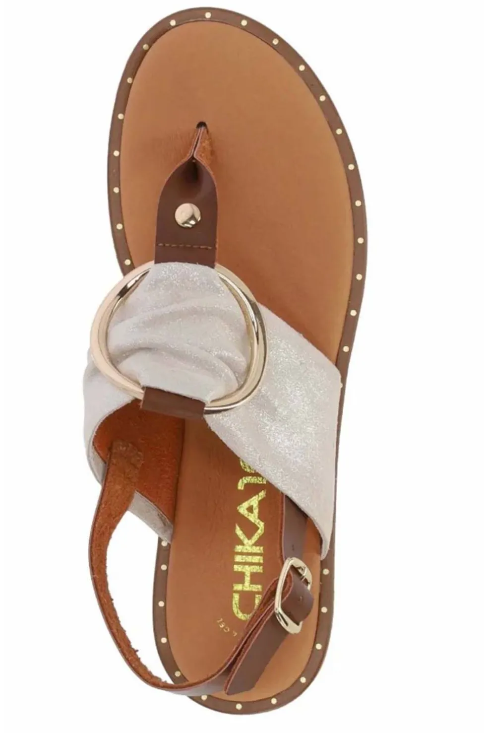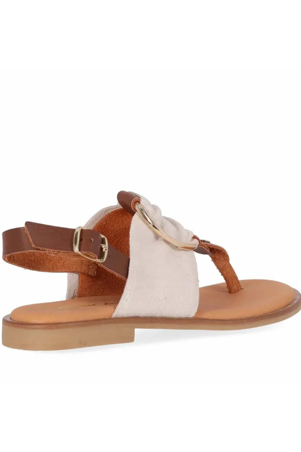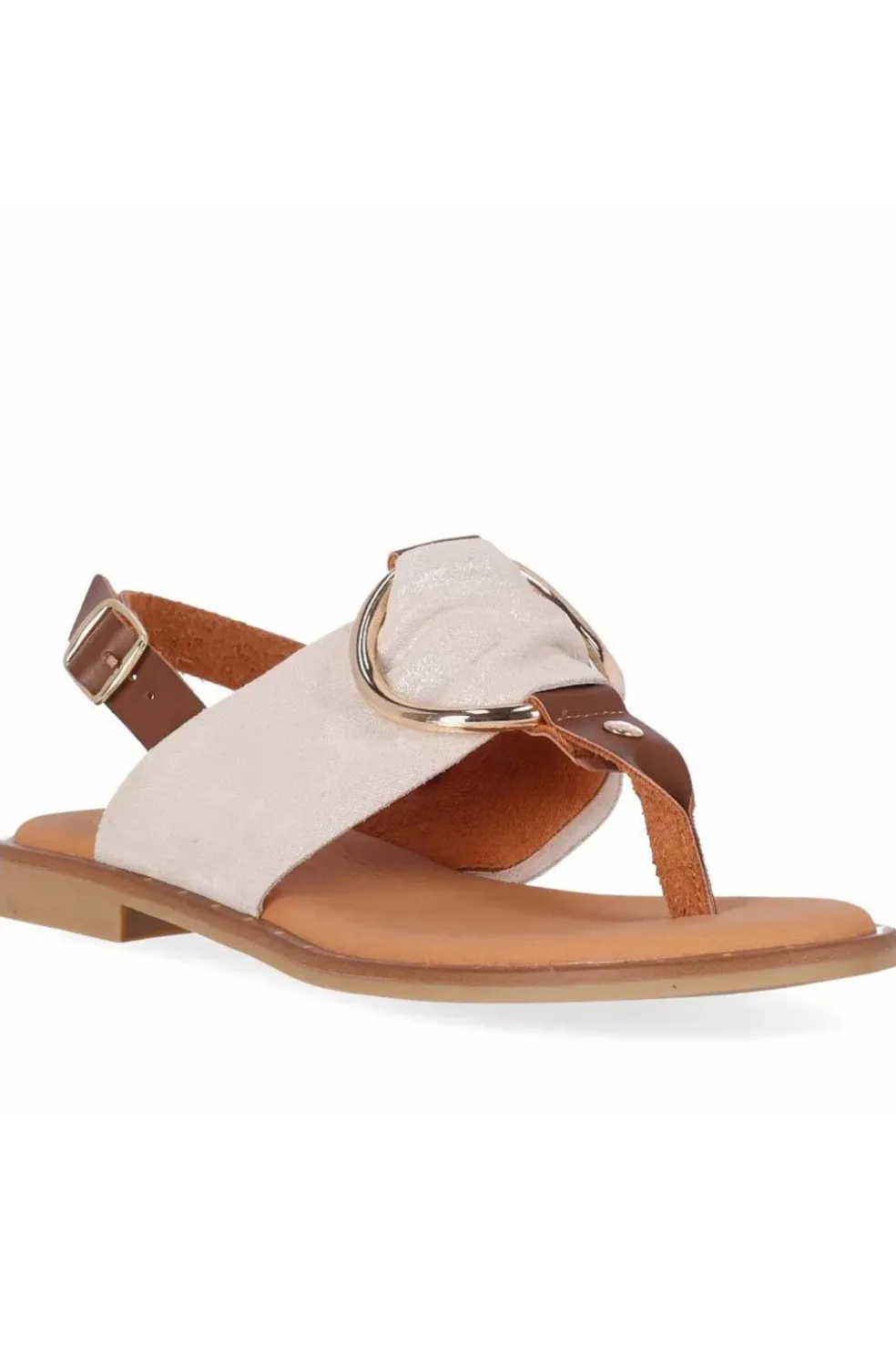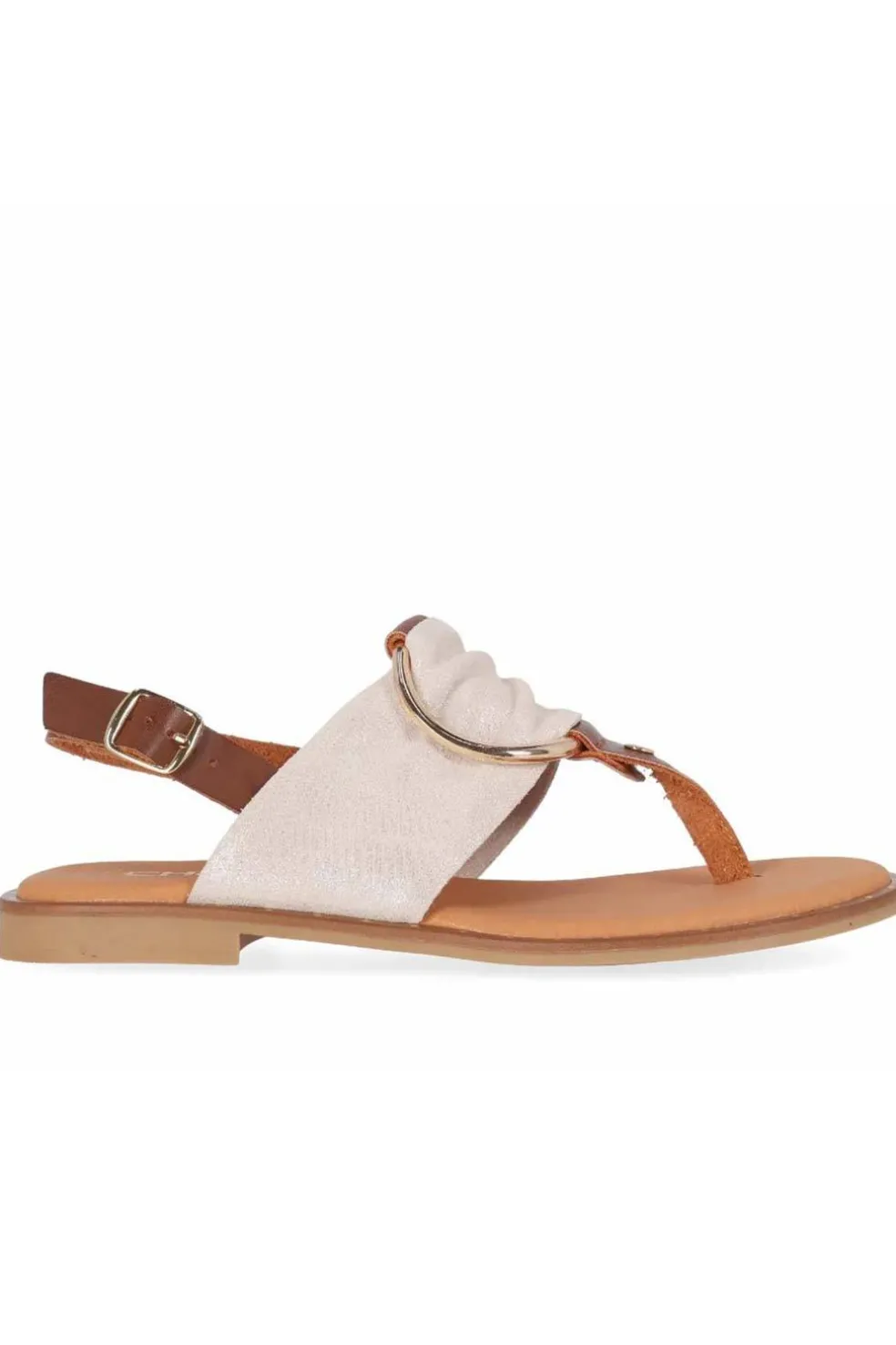 Sandalia plana de mujer. Diseño elegante con tira ajustable en el tobillo y estilo de dedo. Con maxi hebilla central y detalles fruncidos decorativos.