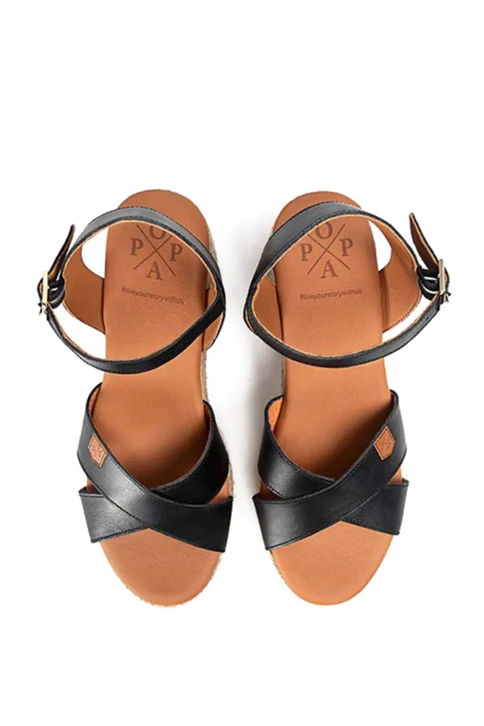 Esta cuña de tacón bajo se caracteriza por sus tiras delanteras cruzadas, en piel negro, y su plataforma combinada en tiras de yute. Estilo y comodidad son sinónimos de este modelo.