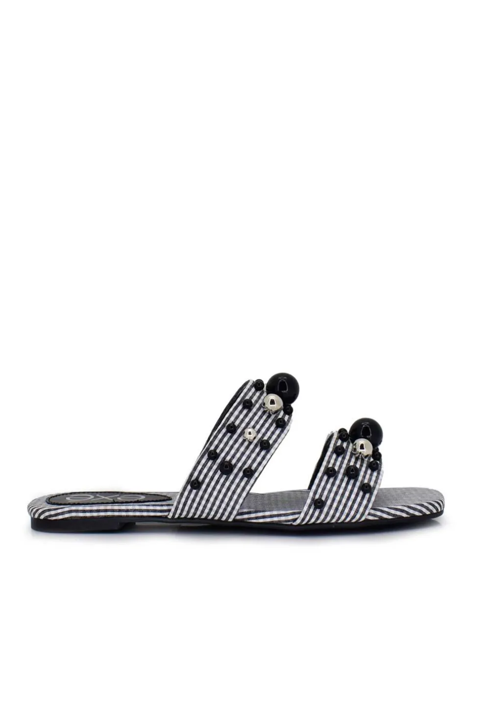 Sandalia plana sintética de color negro con detalle de perlas en sus tiras.