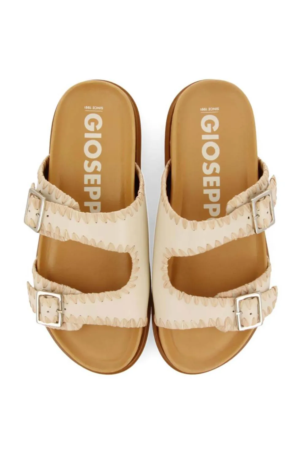 Cómodas y estilosas. Sandalias color off-white tipo BIO de piel con pespuntes de rafia y doble hebilla. Plantilla anatómica de piel muy acolchada con planta de látex para un mayor confort. Piso flexible.