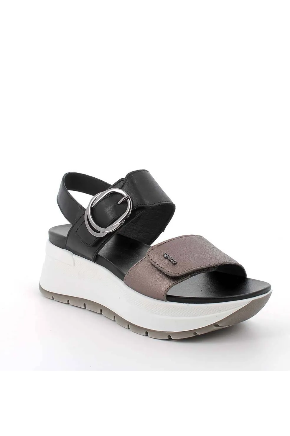 Sandalias de piel con líneas de diseño y estilo deportivo, adornadas con una banda con hebilla ornamental y ajuste con velcro.
