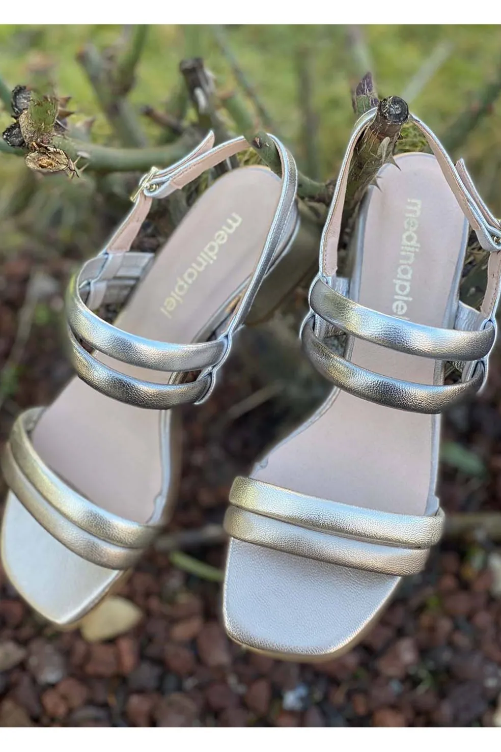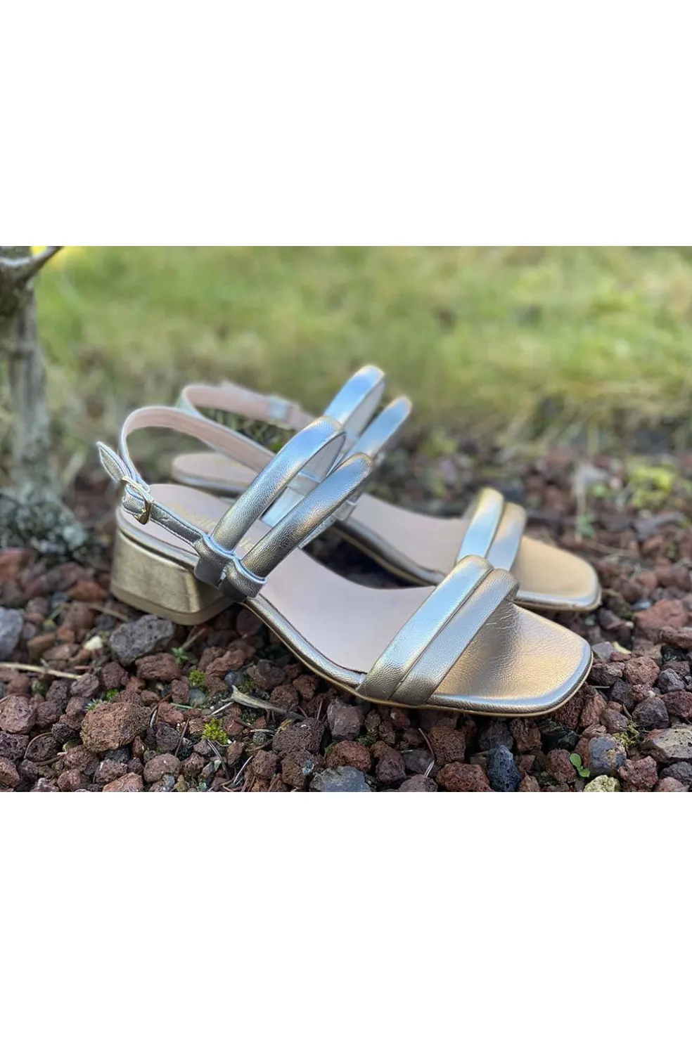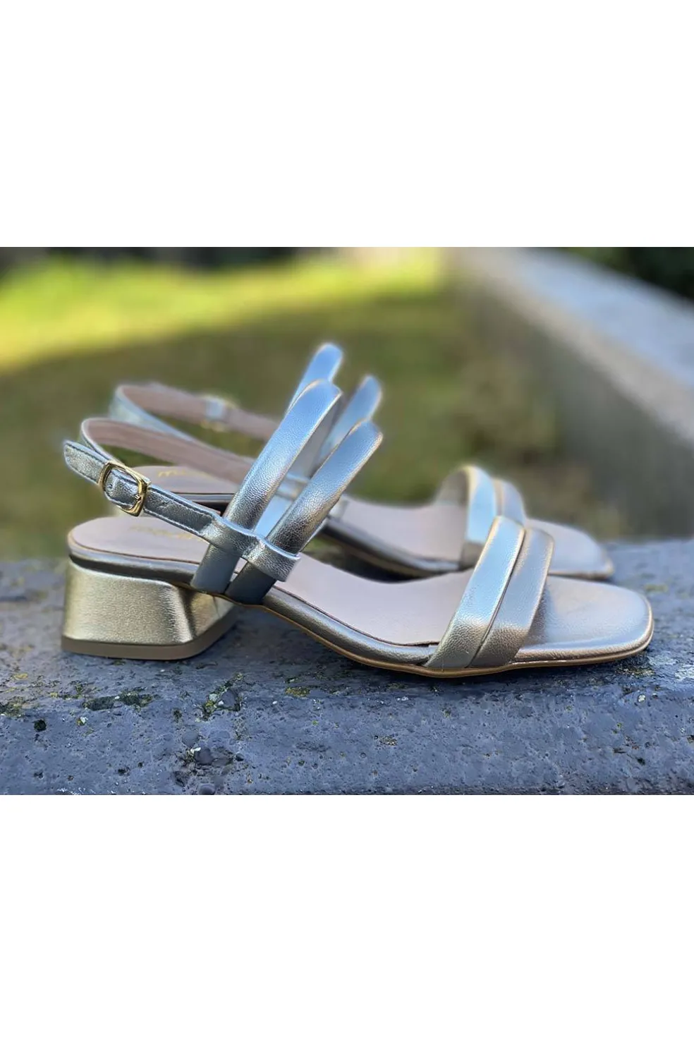 Sandalia de piel en tono metalizado, con tira al talón y cierre de hebilla. Piso fino sintético.