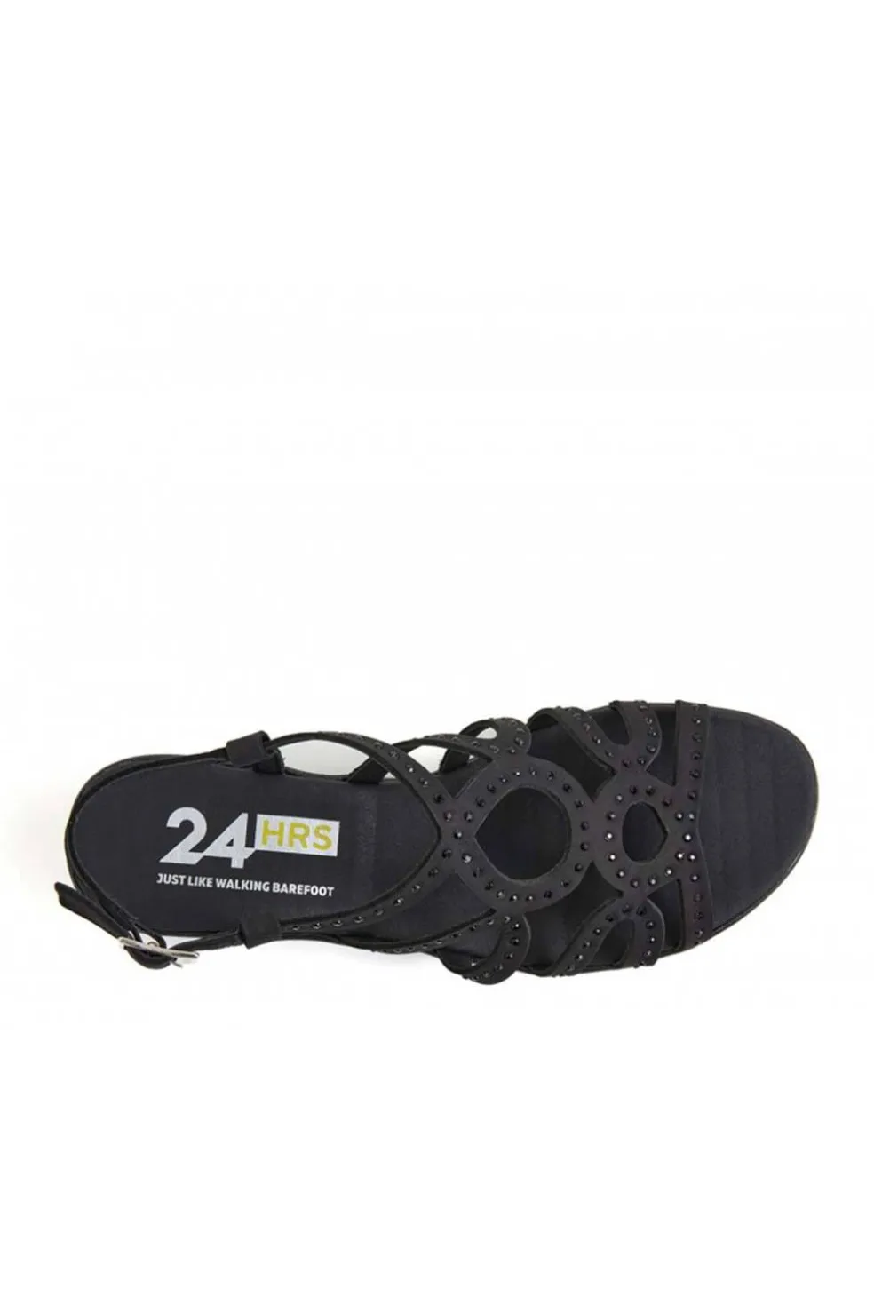 Sandalia mujer fabricada en piel color negro con acabado nobuck alta selección y detalles en pedrería.
