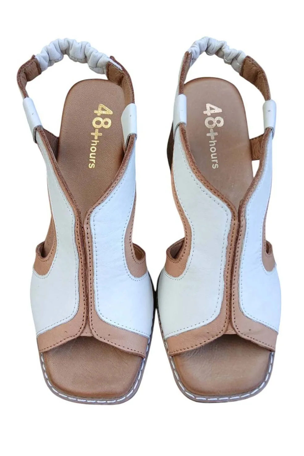 Sandalia mujer fabricados en corte de suaves pieles, en color crema y cuero con tacón de 6 cm de altura.