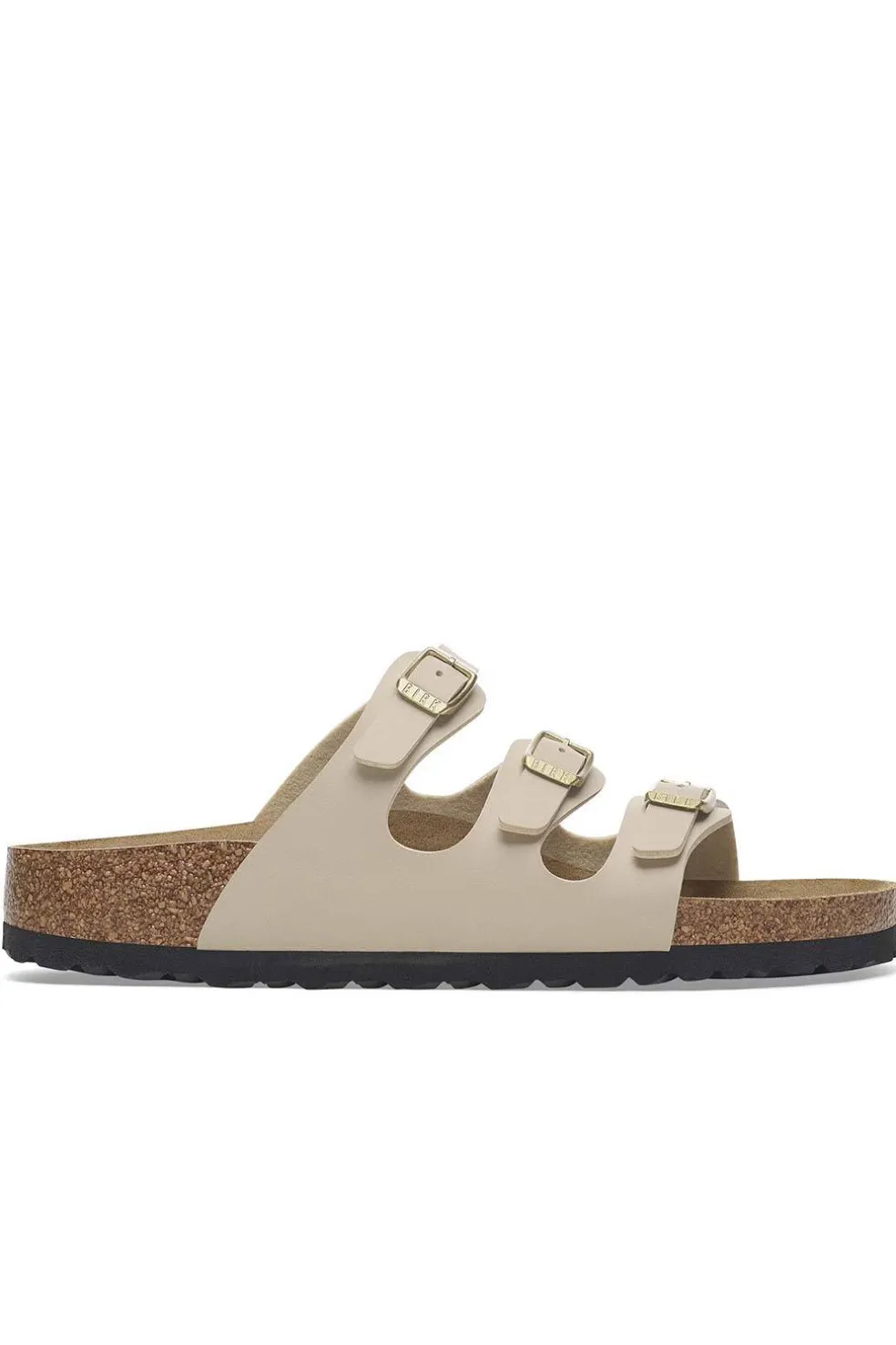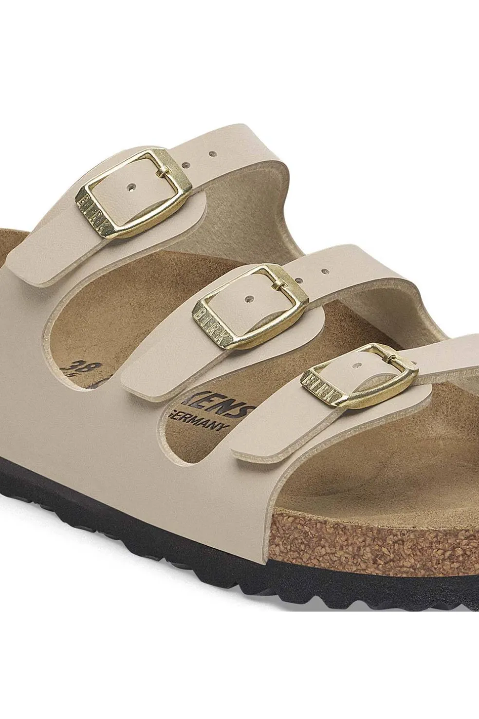 BIRKENSTOCK devuelve a la vida al clásico Florida. Mediante tres correas estrechas con ajuste individual gracias a las robustas hebillas de metal, la sandalia ofrece además buena sujeción y se adapta de manera individual a todas las formas de pie. El material superior está hecho de Birko-Flor ®, que es respetuoso con la piel y fácil de limpiar.