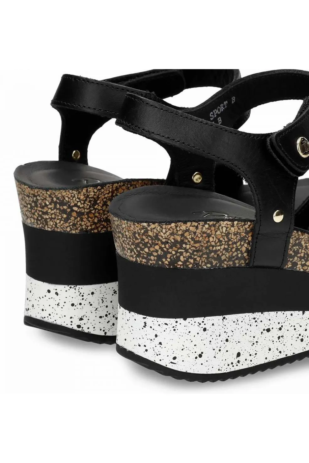 Sandalia de mujer con cuña Cierre de velcro. Piel Napa Negro. Forro interior de Piel. Plantilla anatómica. Suela de poliuretano, flexible y resistente. Altura tacón: 7 cm.