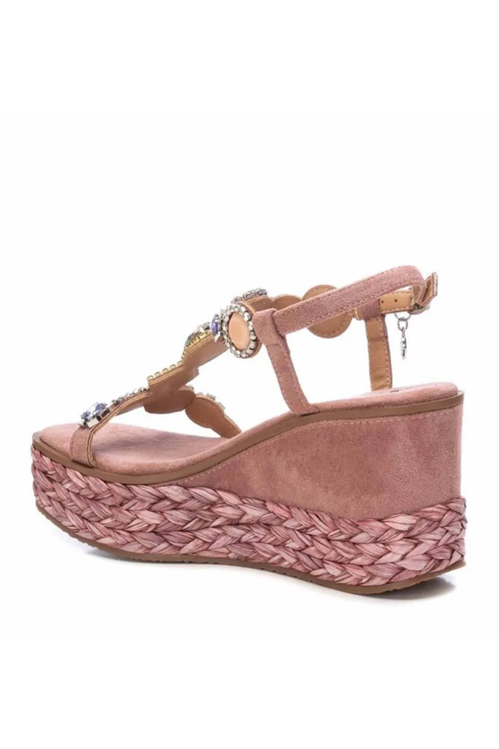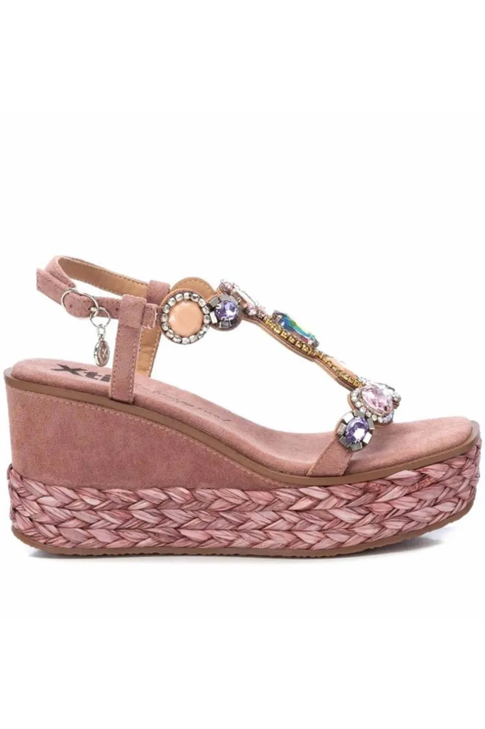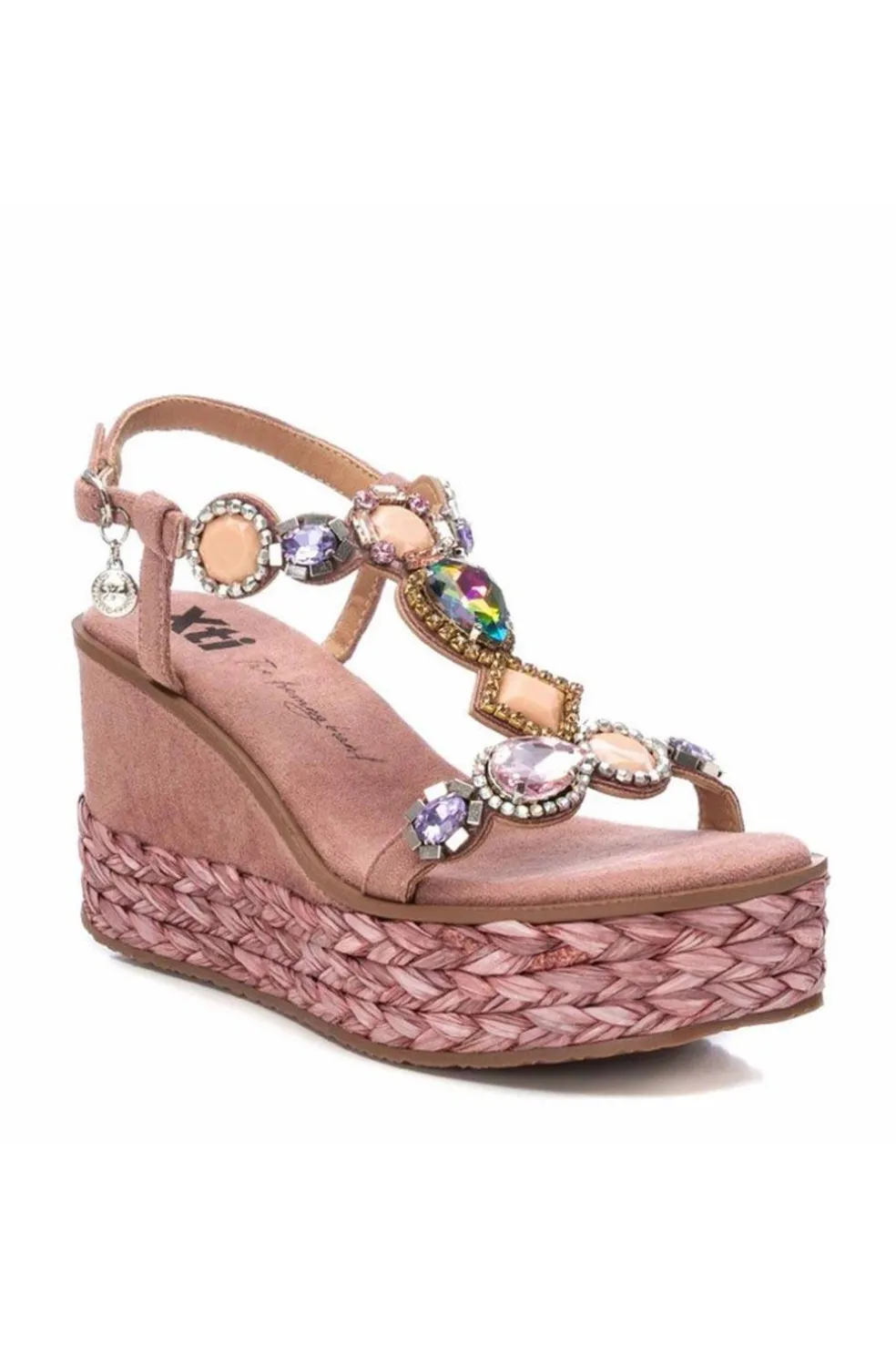 Sandalia de mujer de la marca Xti. Fabricada en material de antelina con piedras preciosas decorativas. Cuña de 9 cm de yute con plataforma delantera. Suela de goma antideslizante. Detalle multicolor de pedrería en la zona del empeine.