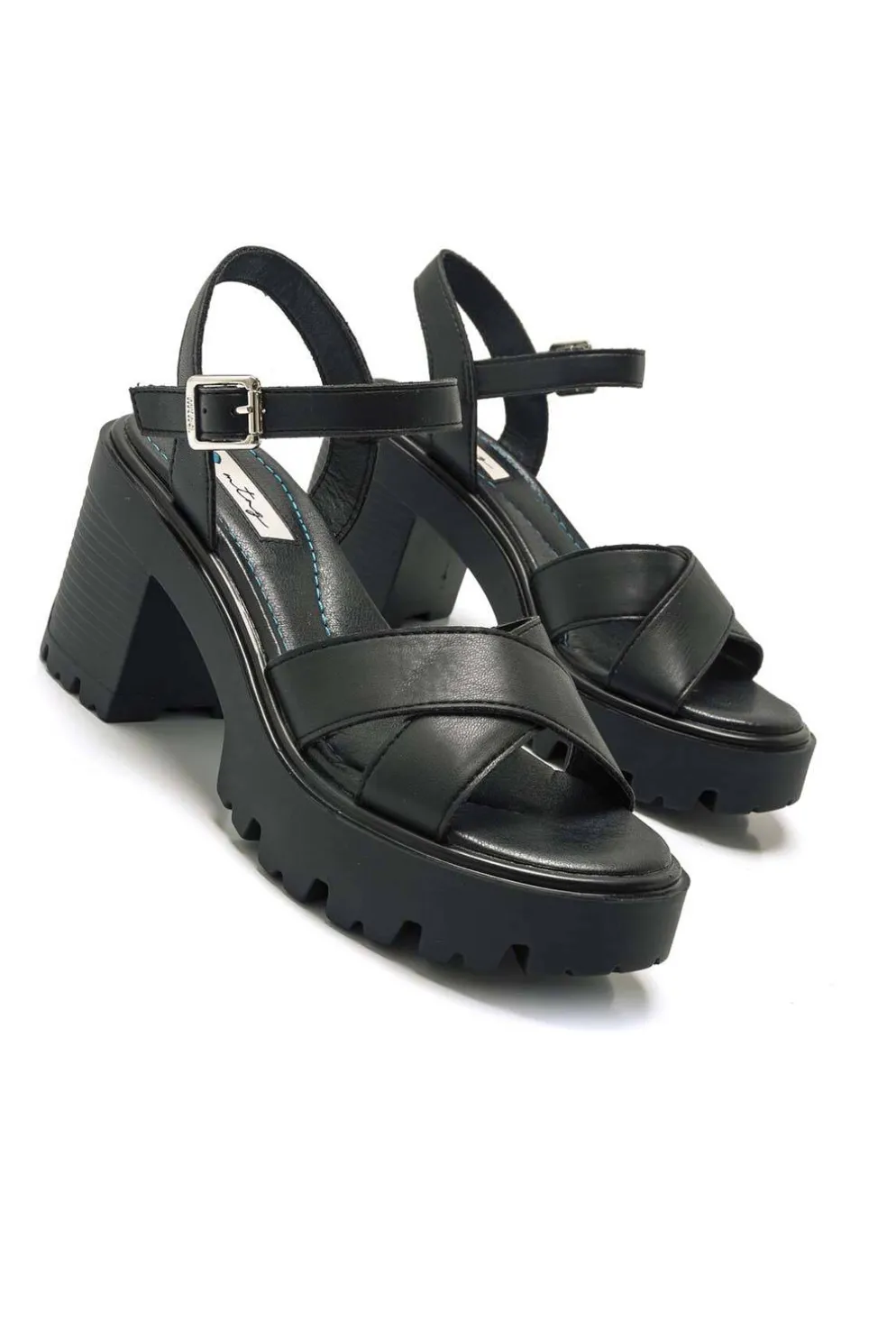Sandalia de tacón Saba Mustang para mujer. Diseñada en color negro, incluye el nombre de la marca en el tacón y la hebilla. Suela dentada con tacón de bloque y plataforma. Cierre de hebilla con tira ajustable al tobillo. Destacan por sus dos tiras cruzadas en la delantera.
