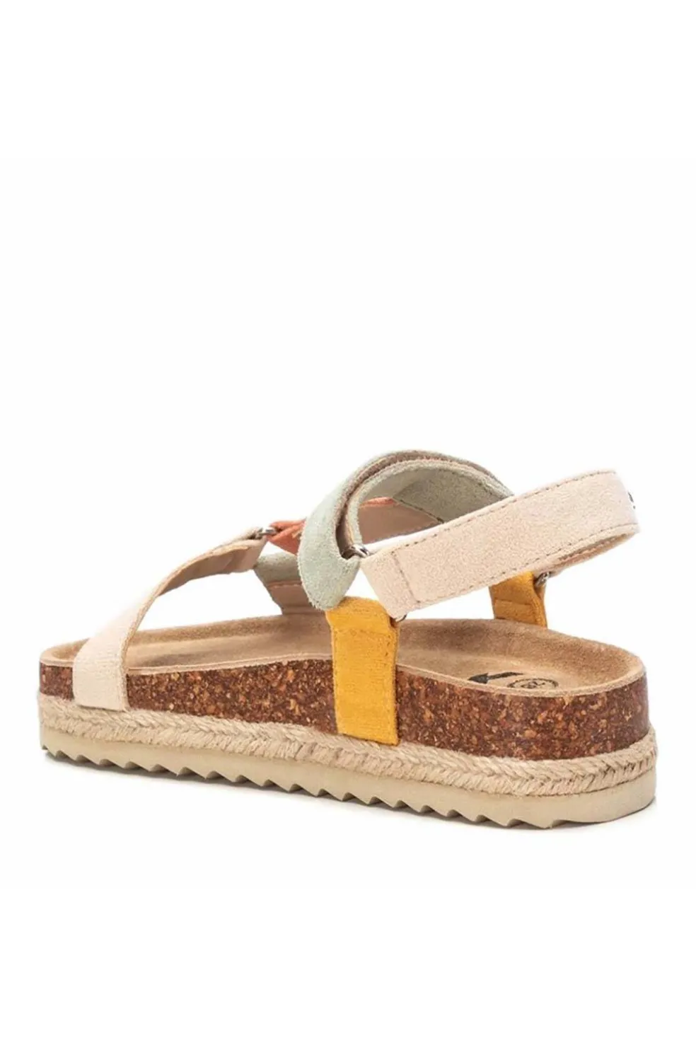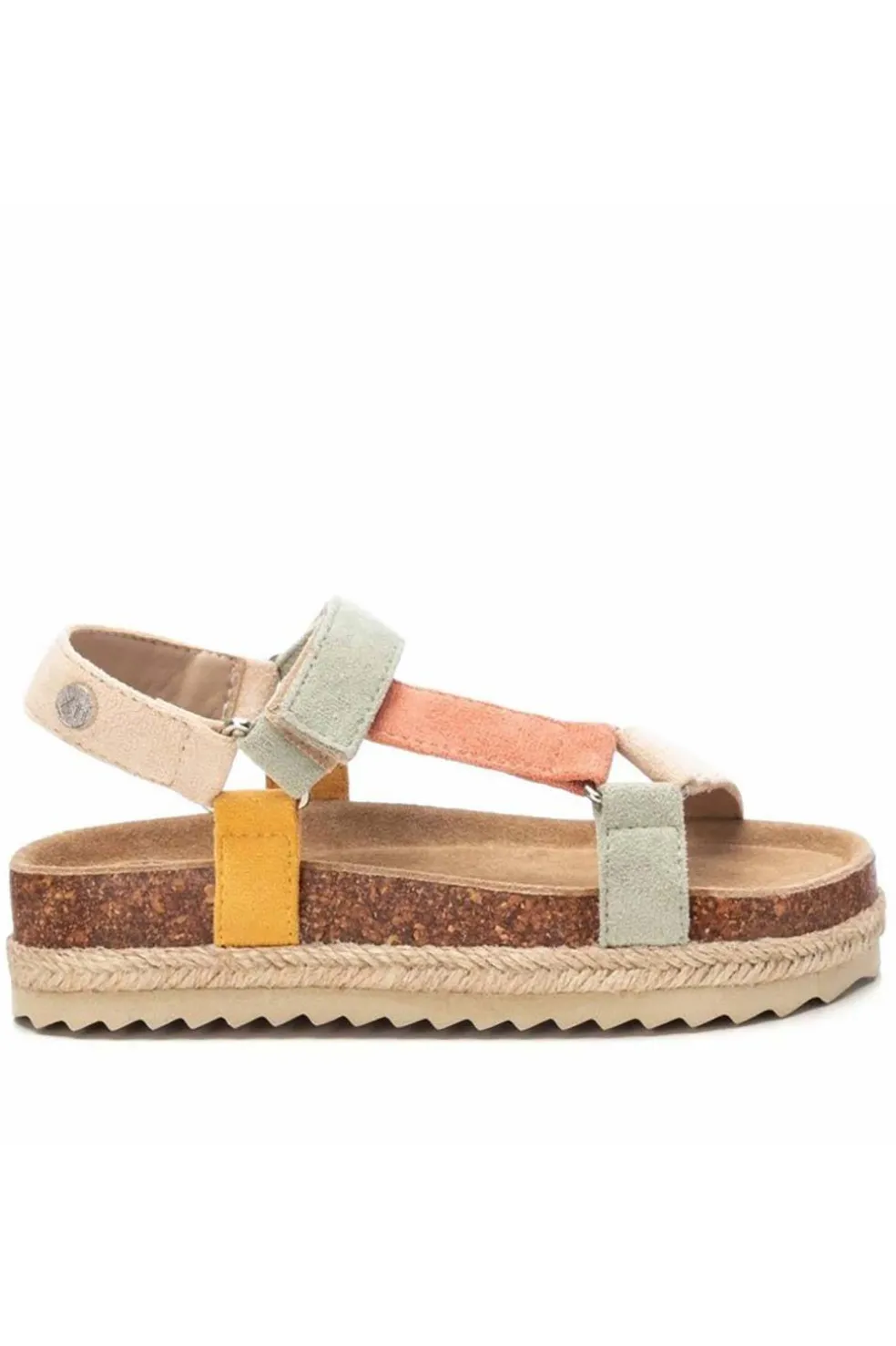 Sandalia multicolor de niña, de la marca Xti Kids. Fabricada en suave antelina. Cierre mediante tira adherente. Plataforma rodeada por tira de yute con suela de goma antideslizante. Una sandalia ideal para completar los looks más veraniegos esta temporada. Este modelo ha obtenido el certificado vegano por la organización mundial PETA