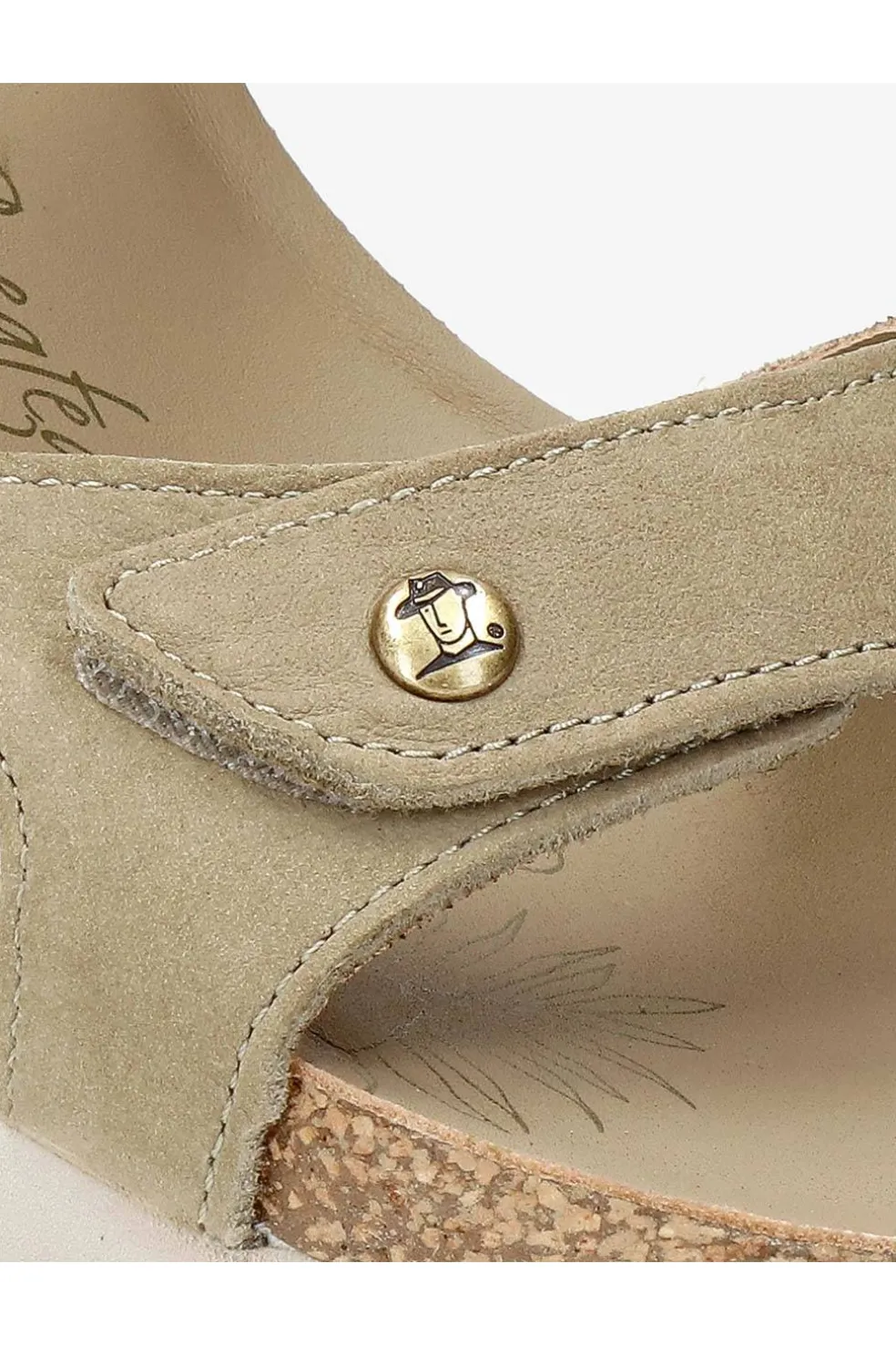Sandalia de mujer con cuña. Piel Nobuck Kaki WATERPROOF. Cierre de velcro. Forro interior de Piel. Plantilla anatómica. Suela de corcho y EVA, ligero, flexible, resistente y adherente.