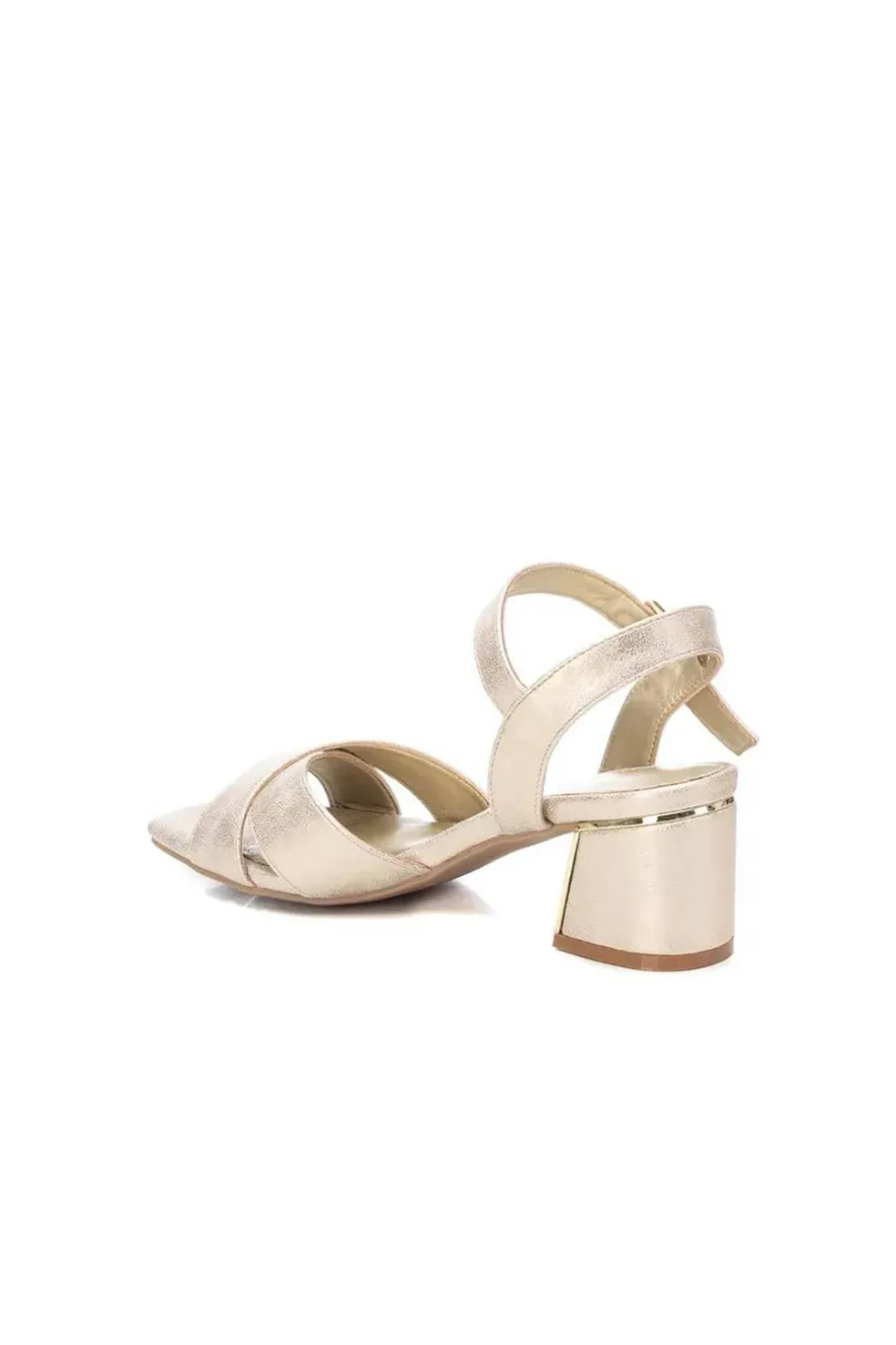 Sandalia de mujer de la marca Xti. Fabricada en material que imita la piel con acabado metalizado. Cierre mediante hebilla. Cómodo tacón ancho de 6 cm con suela de goma antideslizante.
