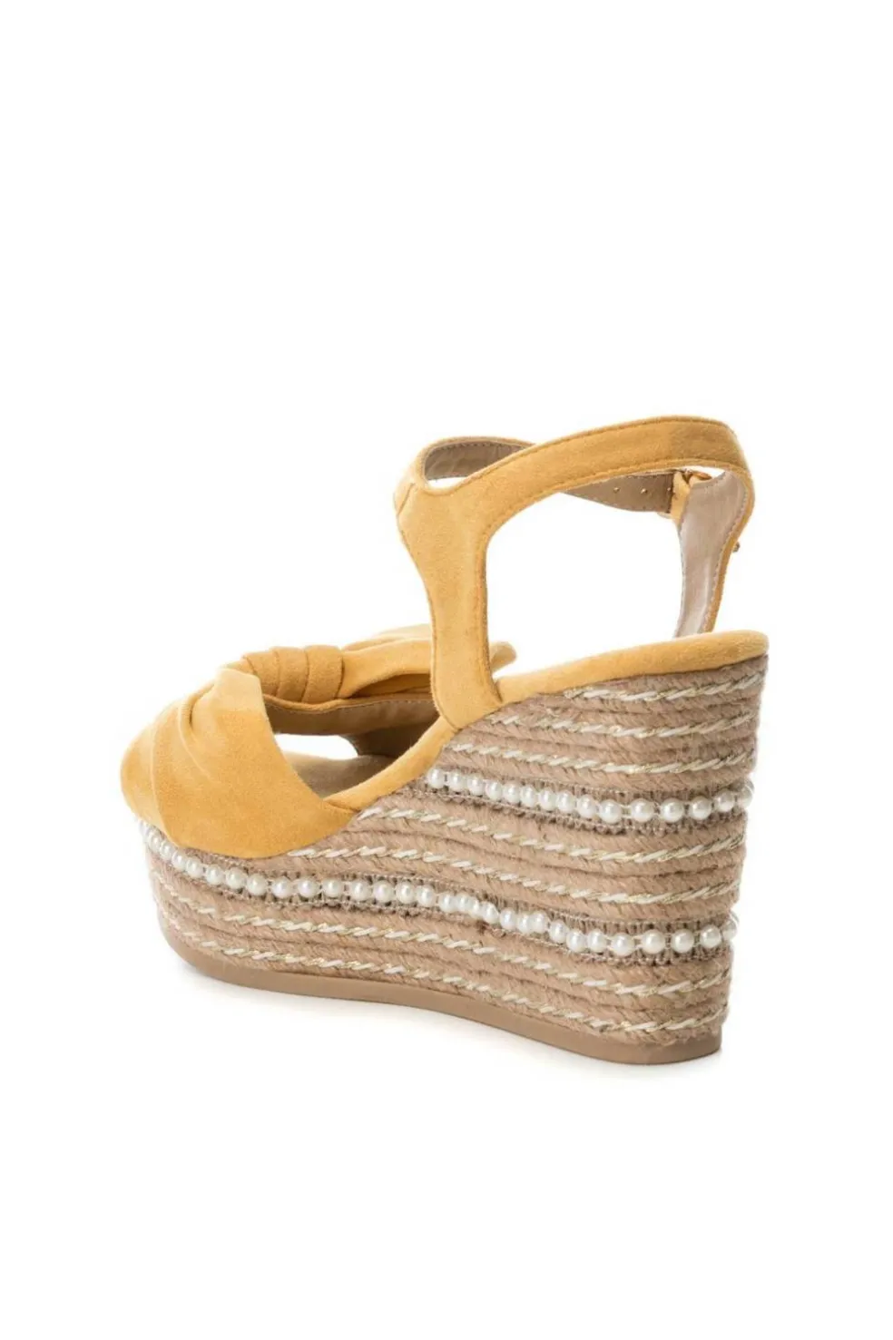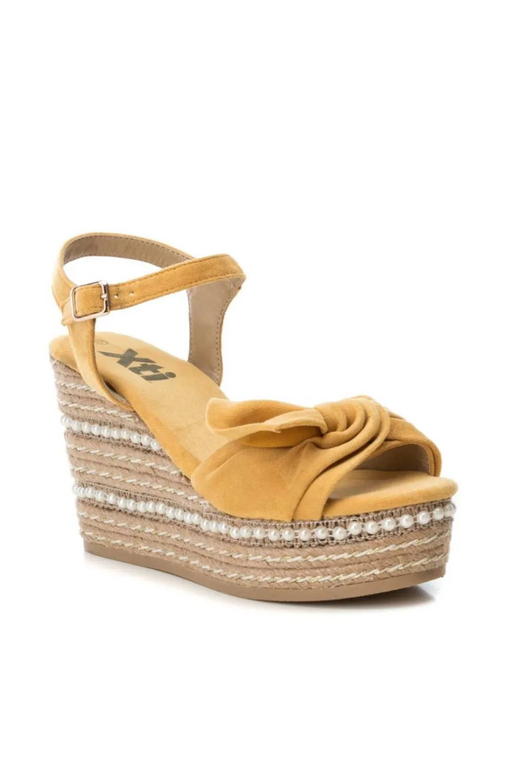 Sandalia con cuña de 10 cm y plataforma de 3 cm. En la parte delantera la tira forma un lazo decorativo muy original. Cierre con hebilla al tobillo. Cuña combinada con yute de diferentes tonalidades y dos tiras de perlas blancas decorativas que le dan un toque muy original a esta cuña.