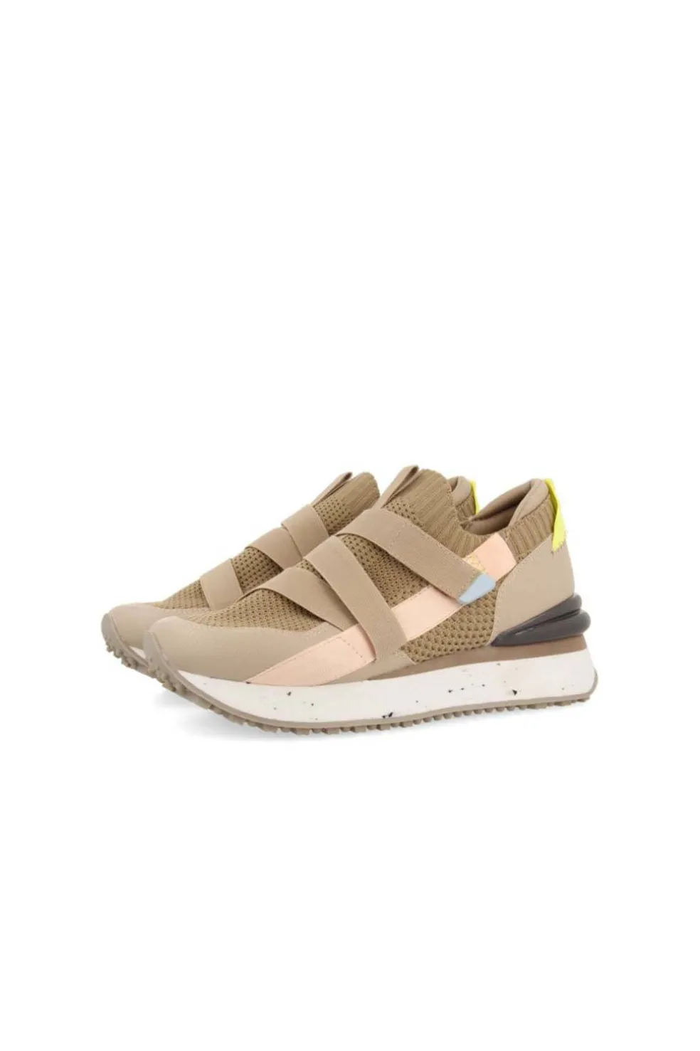 Sneakers beige con elástico que cruza el empeine y detalles de cintas, pespuntes zig-zag y piezas de TPR que funcionan como acentos de color. Plantilla anatómica extraíble. Piso de Eva reciclada. El forro y la plantilla son transpirables de poliéster reciclado.
