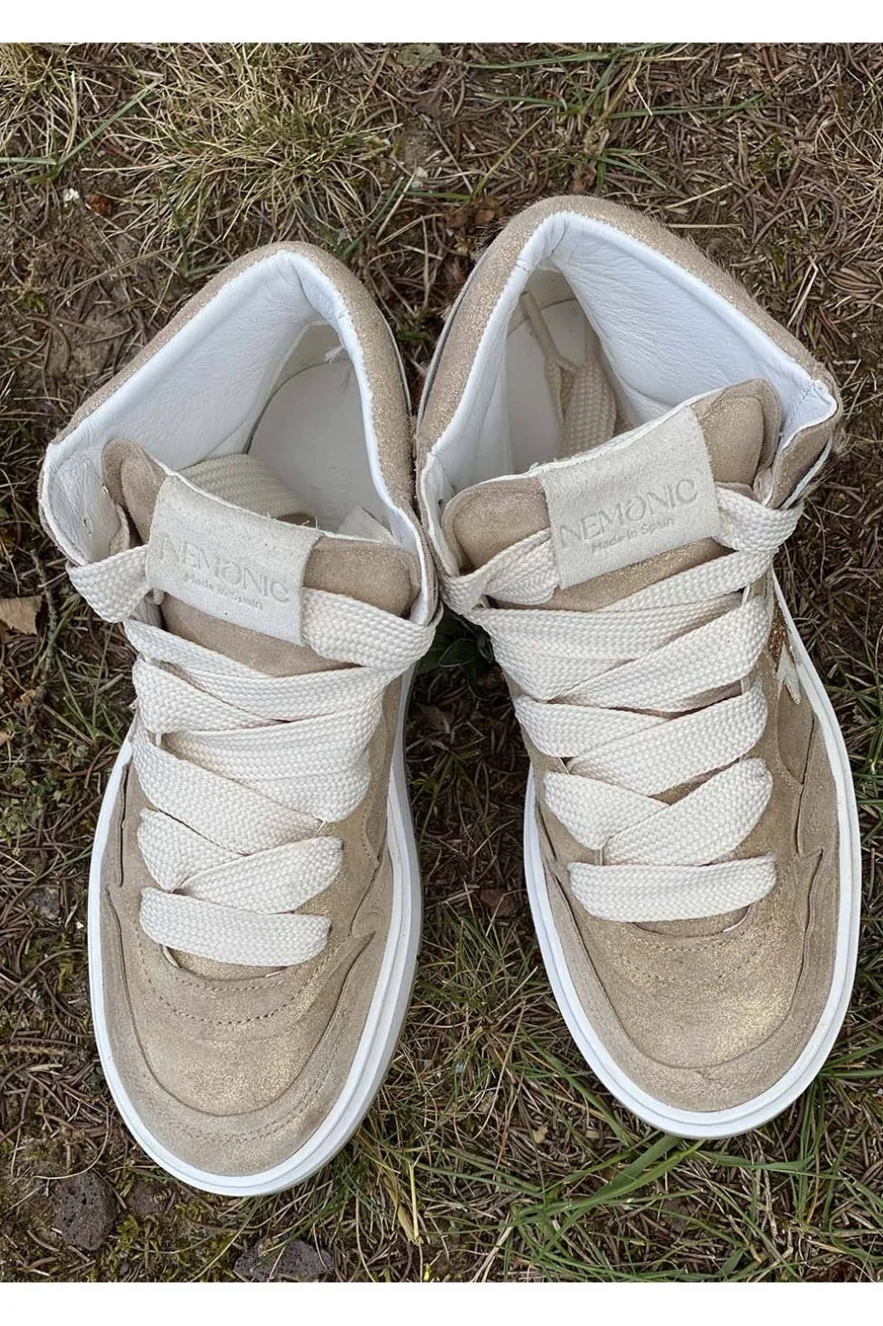 Sneaker Nemonic fabricado en piel en color dorado y detalle animal print leopardo. Cordones en beige. Fabricado en España