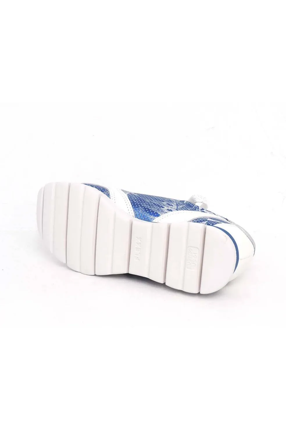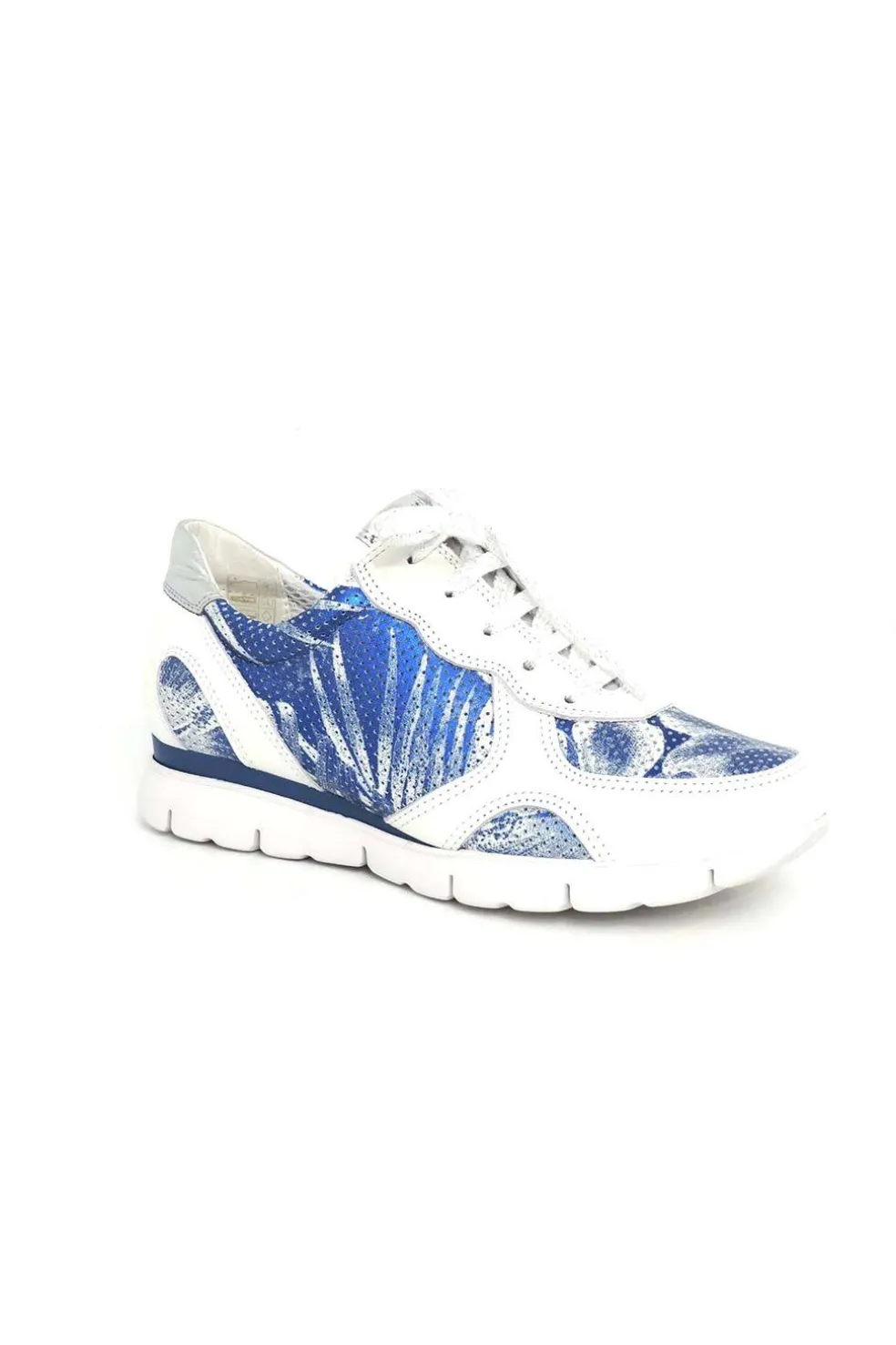 Deportivo de piel que combina el color blanco y azul.