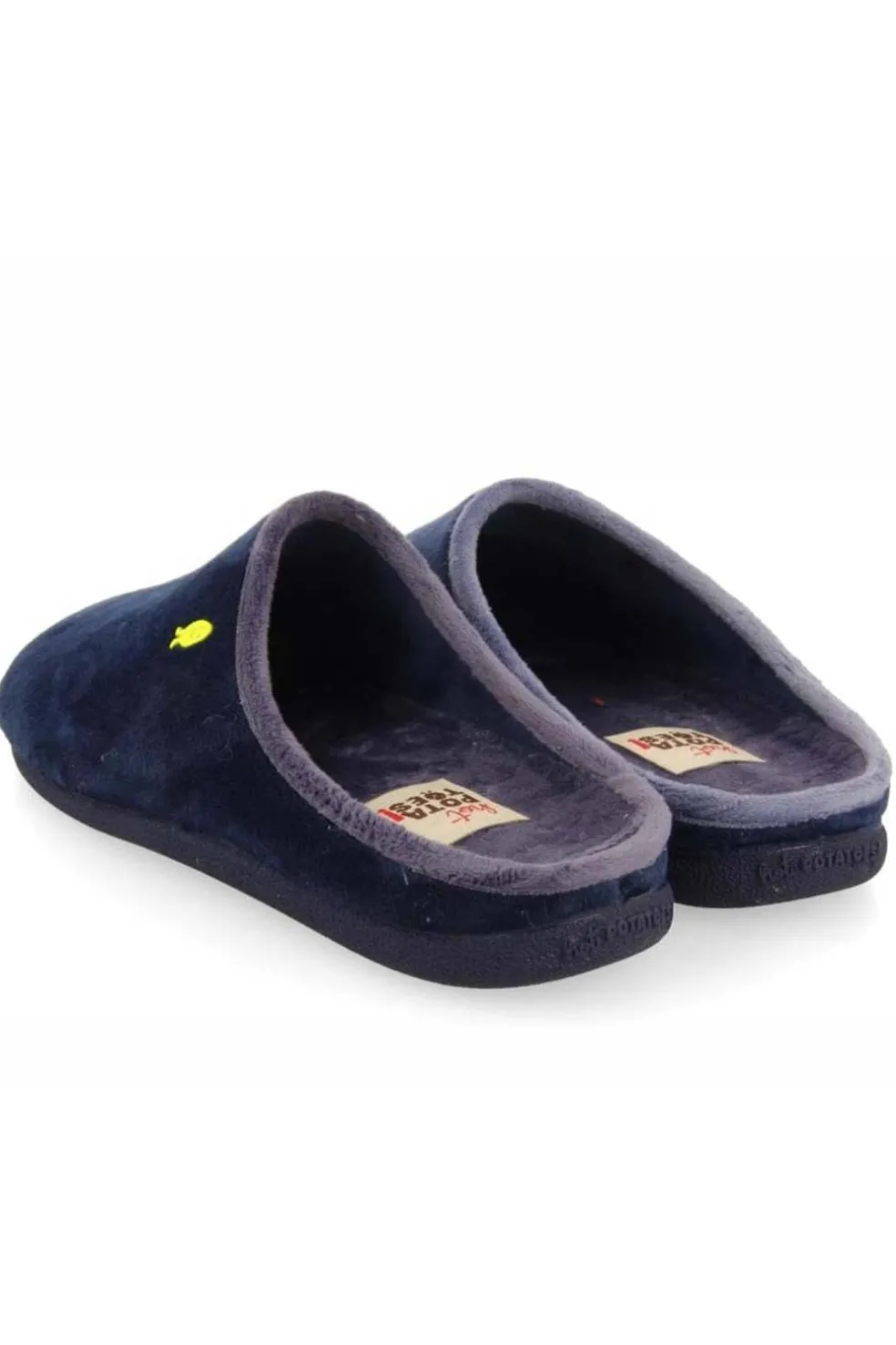 ¿Buscas el modelo perfecto? Zapatillas de estar por casa de pelo color azul marino con ribete en color en contraste. Plantilla extraíble fabricada con poliéster reciclado. Forro transpirable. Suela de goma natural con virutas de EVA reciclada. Descubre las novedades de Hot Potatoes.