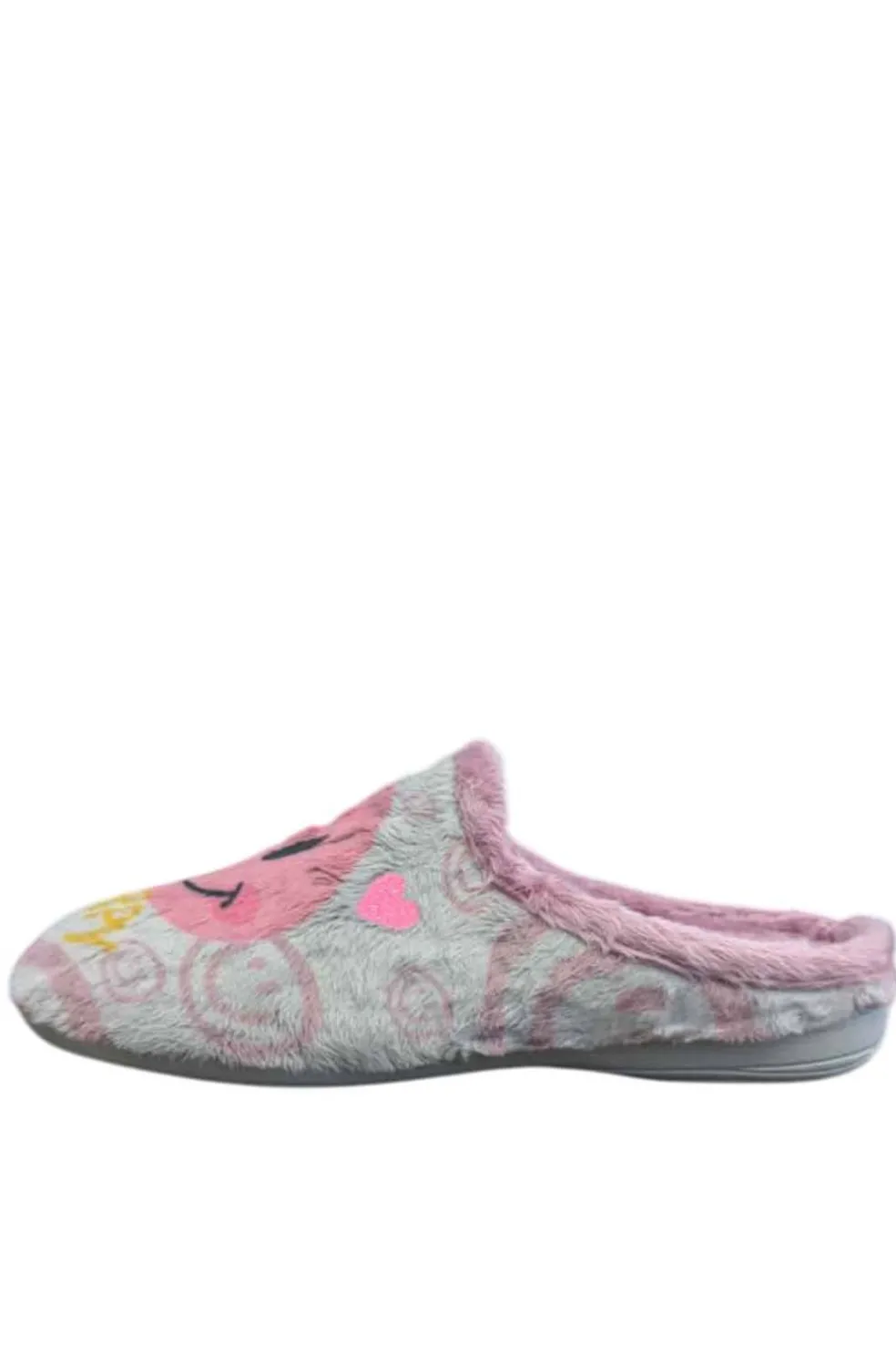 Zapatilla de casa Cosdam Biorelax para mujer, abierta y confeccionada con tejido suave y confortable. Su color gris piedra y estampado divertido aportan un toque alegre, mientras que sus plantillas extraíbles ofrecen mayor comodidad e higiene.