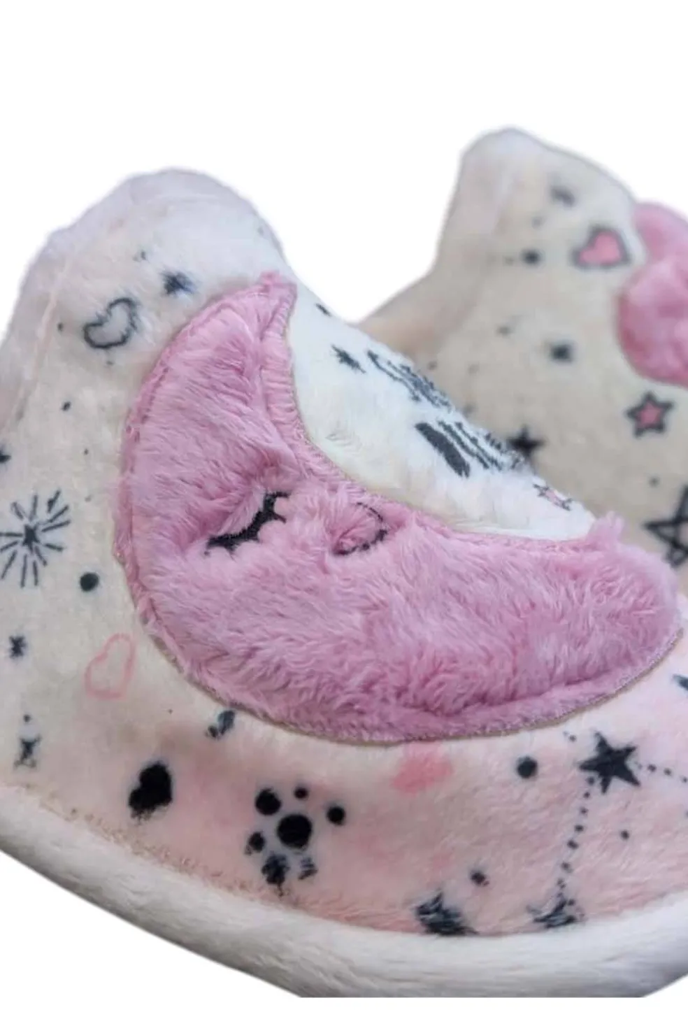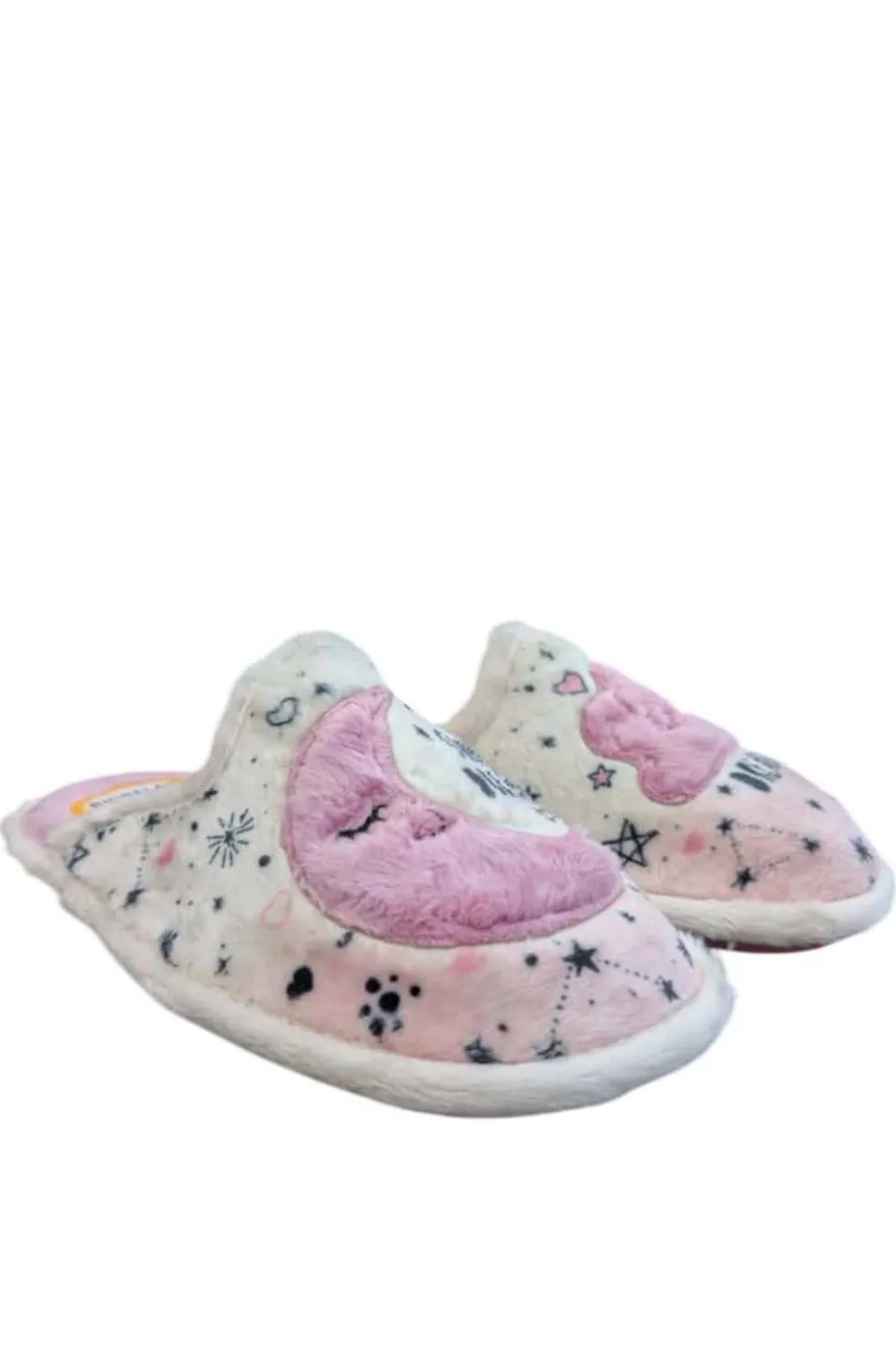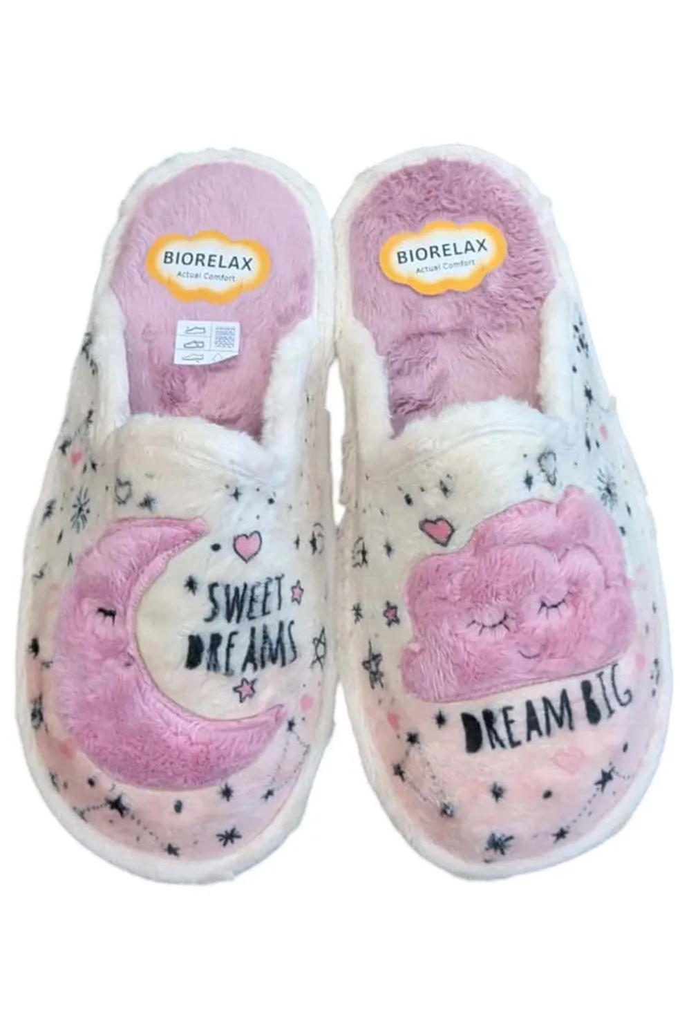 Zapatilla de casa Cosdam Biorelax para mujer, abierta por el talón y confeccionada con tejido suave y confortable. Su color coral y el estampado de luna y nube con la frase “Sweet Dreams, Big Dreams” aportan un toque tierno y relajante, ideal para disfrutar del confort en casa.