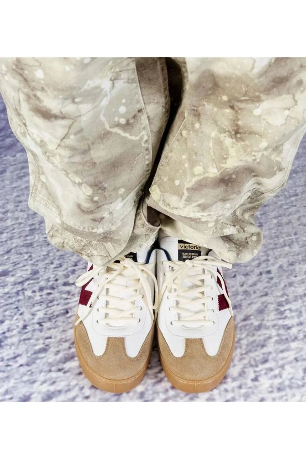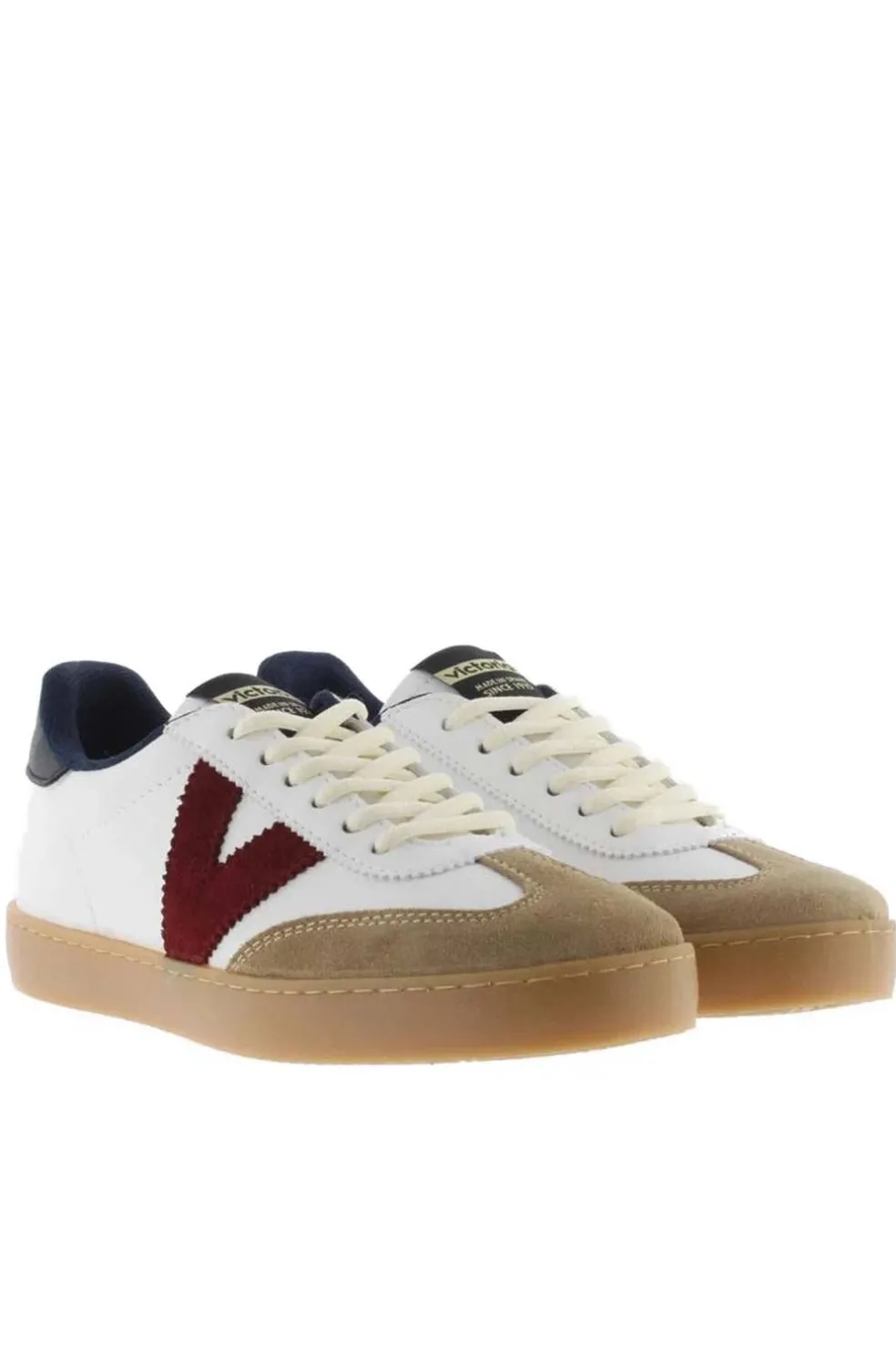 Zapatillas blancas unisex fabricadas en España en material efecto piel. Detalles de color en la V del lateral y la pieza trasera. Puntera de serraje con nuevo corte ciclista. Su suela traslúcida color caramelo aporta un toque de estilo retro. Además, incluyen una plantilla más ergonómica, confeccionada a partir de materiales reciclados, proporcionando un confort superior en cada paso.
