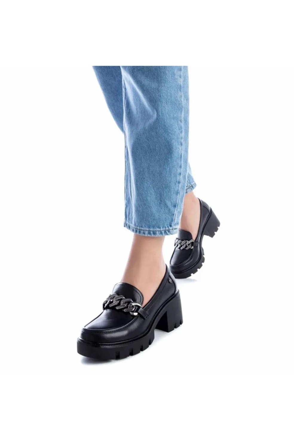 Mocasín de mujer, de la marca Xti. Fabricado en material que imita la piel. Cadena decorativa en el frente. Tacón ancho de 6 cm con suela dentada de goma antideslizante. Plataforma de 2 cm. Este modelo ha obtenido el certificado vegano por la organización mundial PETA (Organización de los derechos de los animales).