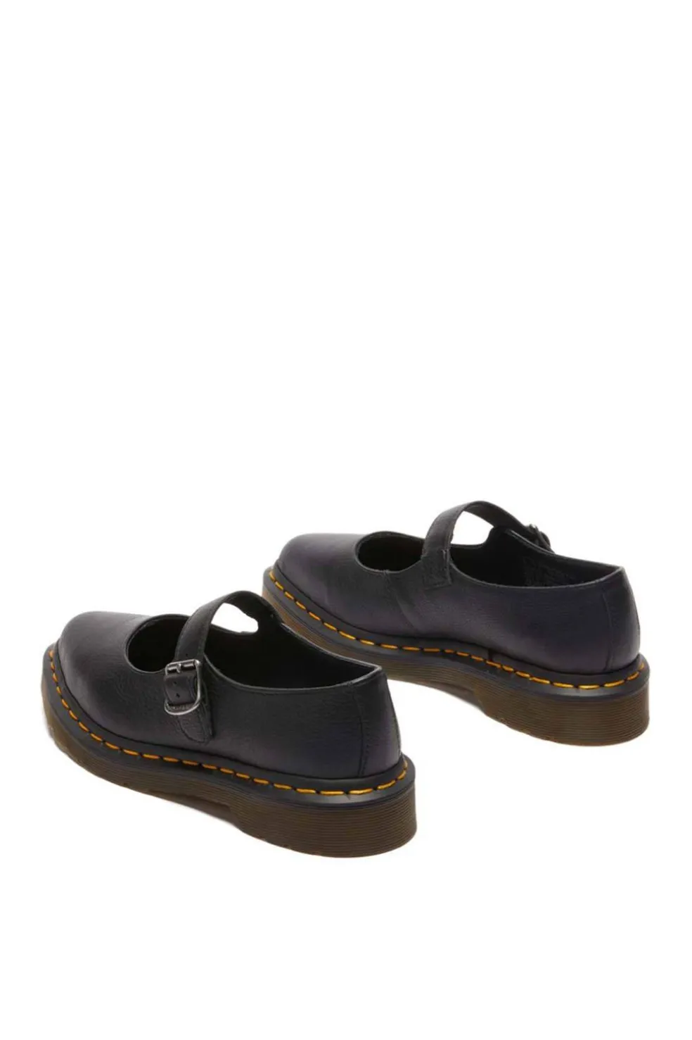 Bailarina en punta hecha de suave piel Virginia. Se abrocha con una sola correa con una hebilla con la marca DM´s. La suela cónica está marcada con el característico dibujo estriado de DM´s y se asegura con una costura de ribete amarillo.