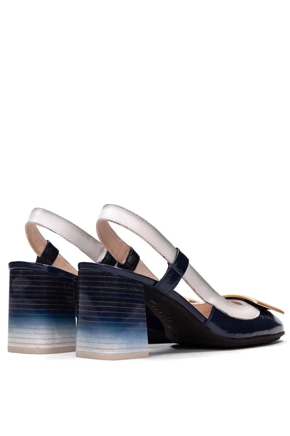 Zapato destalonado con punta redonda elaborado en napa. Diseño bicolor, tacón bloque efecto degradado y adorno en la puntera. Este zapato incorpora la tecnología TRIFLOW, amortigua cada paso aportando flexibilidad y confort en la pisada, gracias a su triple almohadillado.