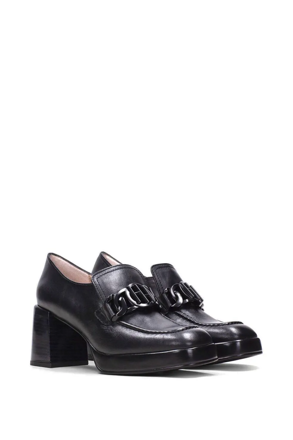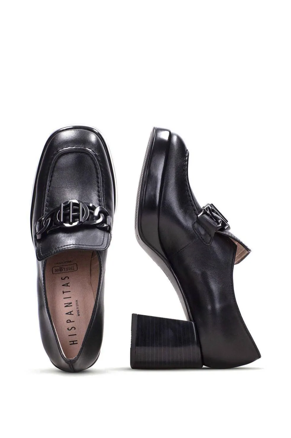 Zapato de punta redonda, con tacón bloque y plataforma. Efecto acharolado y adorno en el empeine con isotipo doble «»H»». Este zapato incorpora la tecnología TRIFLOW, amortigua cada paso aportando flexibilidad y confort en la pisada, gracias a su triple almohadillado. Altura: 7 cm..