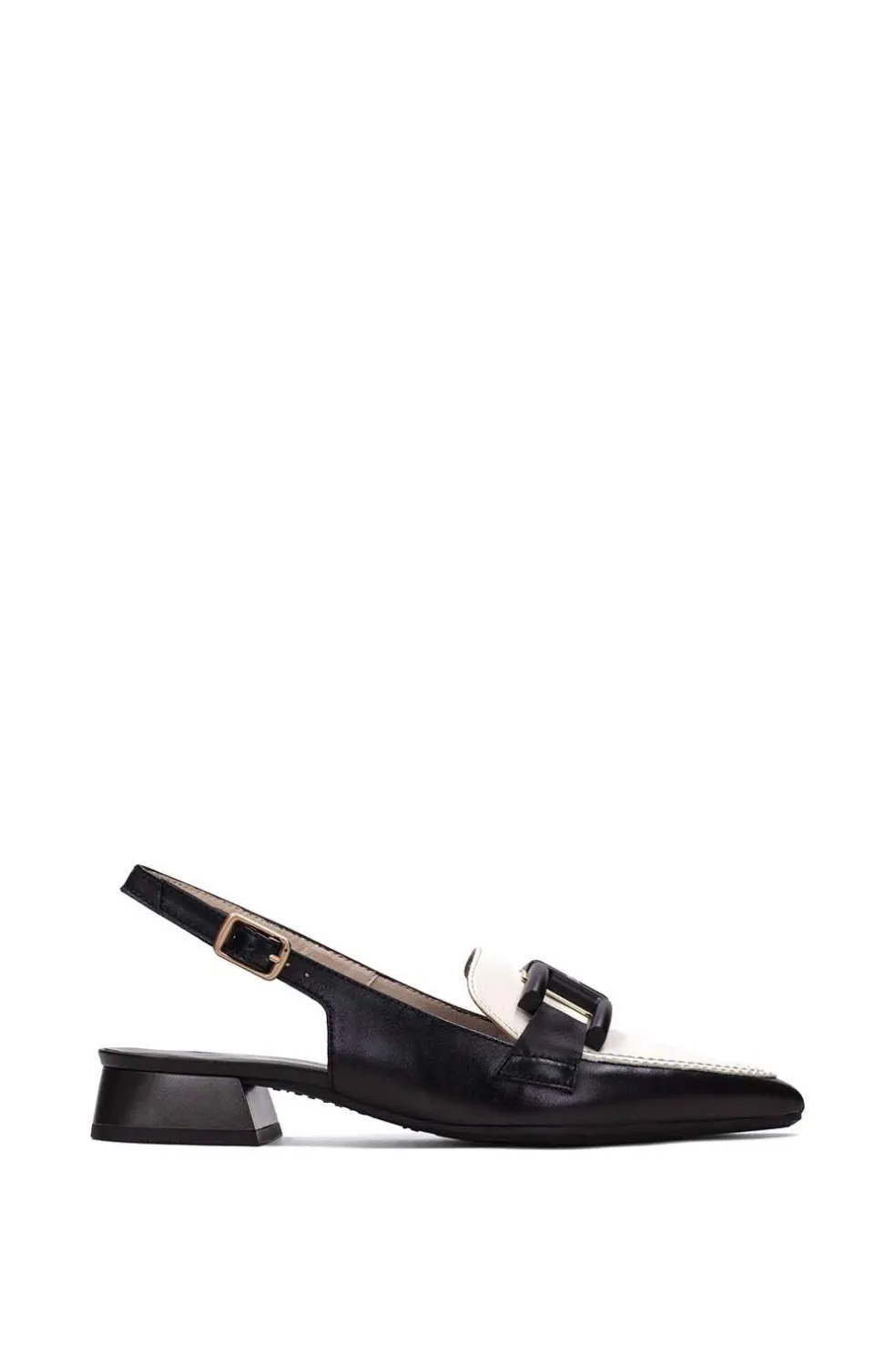 Zapato destalonado con punta elaborado en piel. Diseño bicolor, tacón bloque y adorno en el empeine. Este zapato incorpora la Tecnología Triflow de triple almohadillado, generando un efecto acolchado al caminar. Altura: 2,5 cm.