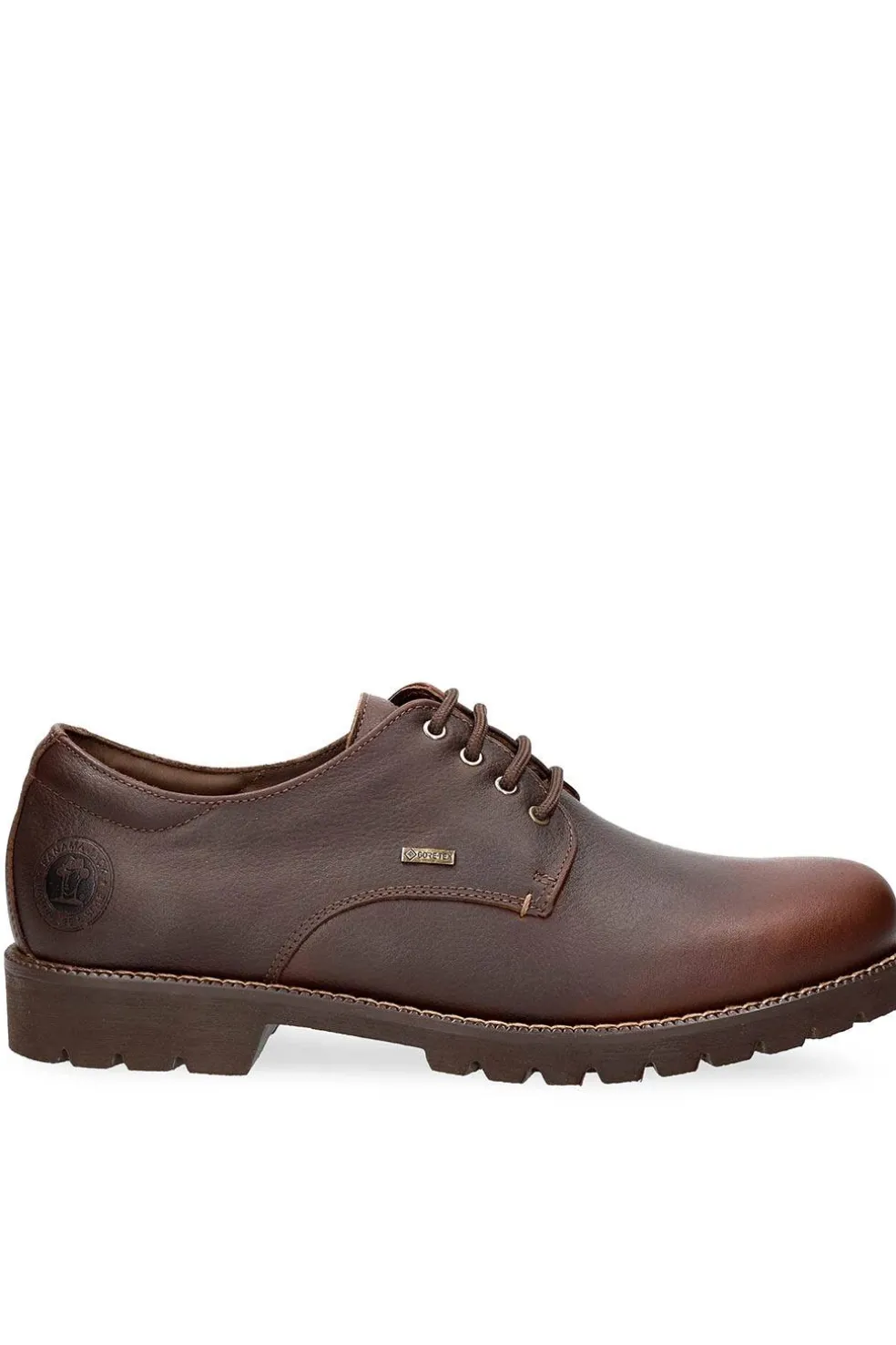 Zapato de hombre confeccionado en piel Napa Grass Castaño WATERPROOF, ideal para cualquier ocasión. Cuenta con cierre de cordones y forro interior de Gore-Tex® que garantiza impermeabilidad y transpirabilidad. Su plantilla anatómica extraíble proporciona comodidad, mientras que la suela de caucho natural es flexible y resistente. Con una altura de tacón de 3 cm, este calzado es 100% hecho en España, combinando calidad y estilo.